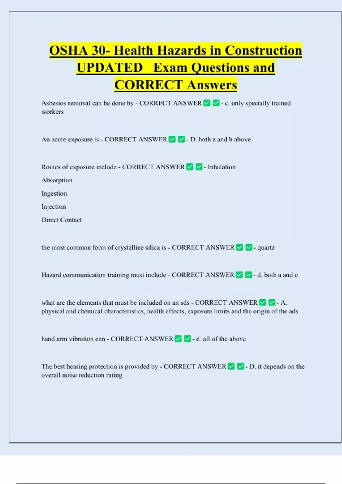 OSHA 30- Health Hazards in Construction UPDATED Exam Questions and CORRECT Answers Asbestos removal can be done by - CORRECT ANSWER workers An acute exposure is - CORRECT ANSWER - c. only specially trained - D. both a and b above Routes of exposure include - CORRECT ANSWER Absorption Ingestion Injection Direct Contact - Inhalation