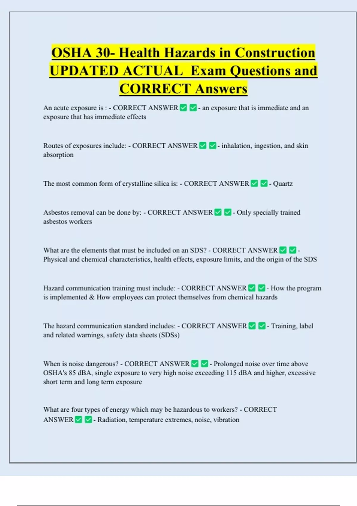 OSHA 30- Health Hazards in Construction UPDATED ACTUAL Exam Questions and CORRECT Answers An acute exposure is : - CORRECT ANSWER exposure that has immediate effects Routes of exposures include: - CORRECT ANSWER absorption - an exposure that is immediate and an - inhalation, ingestion, and skin The most common form of crystalline silica is: - CORRECT ANSWER Asbestos removal can be done by: - CORRECT ANSWER - Quartz