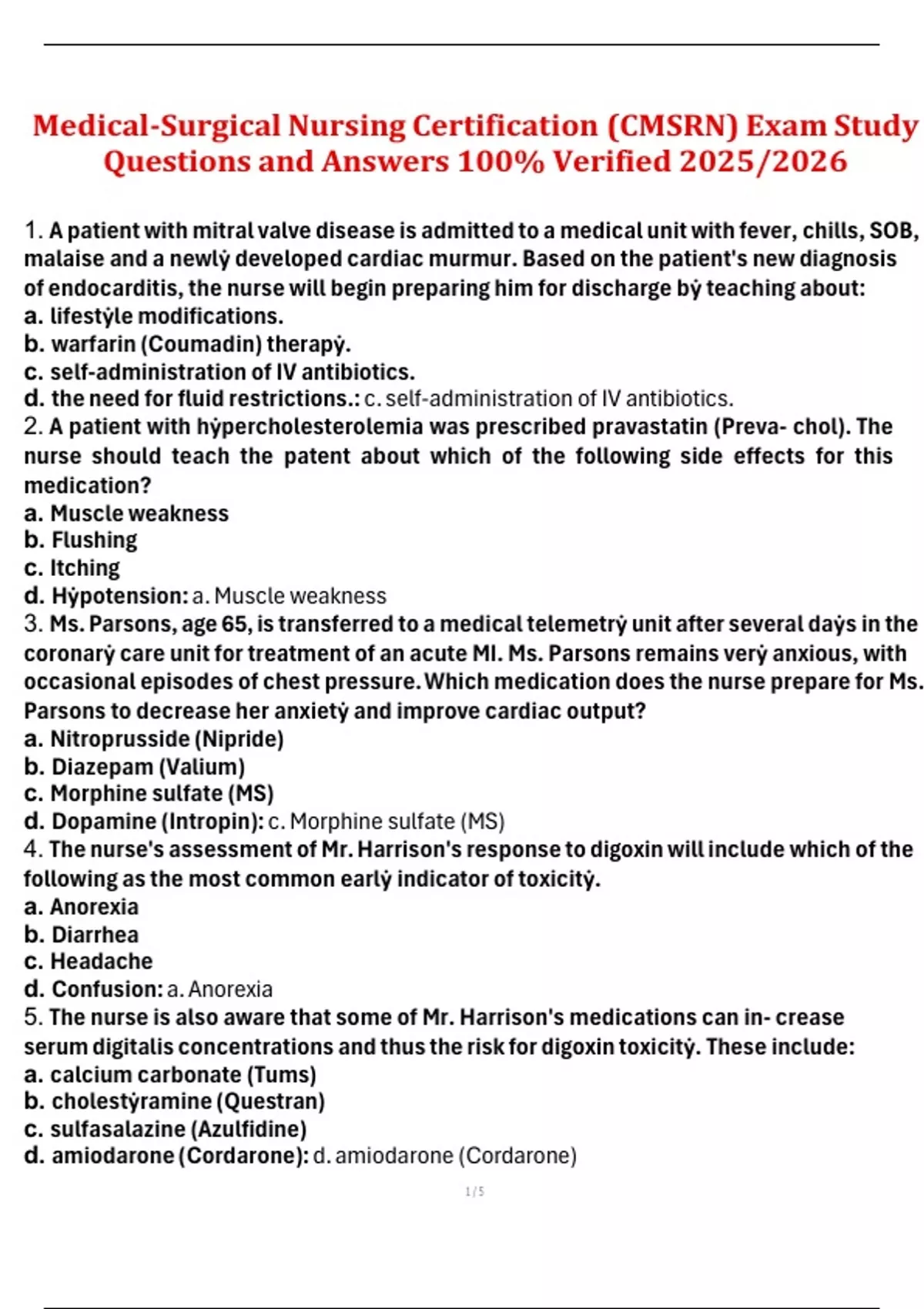 This document features a comprehensive set of study questions and 100% verified answers for the CMSRN (Certified Medical-Surgical Registered Nurse) exam, updated for the 2025/2026 exam cycle. It covers all major content areas, including body systems, nursing interventions, pharmacology, and patient care management. Ideal for focused revision and thorough certification exam preparation.