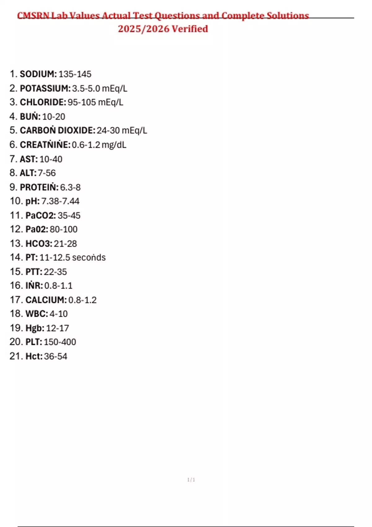 CMSRN Lab Values – Actual Test Questions and Complete Verified Solutions – 2025/2026