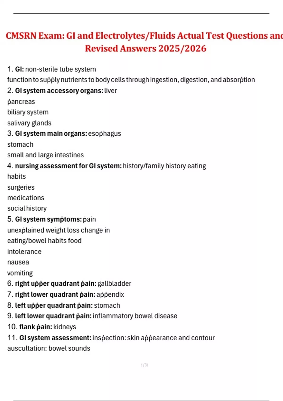 This document includes actual CMSRN exam questions focused on the gastrointestinal system and fluid & electrolyte balance, with thoroughly revised and verified answers for the 2025/2026 testing cycle. It covers essential topics such as GI disorders, electrolyte imbalances, fluid management, and nursing interventions—ideal for targeted review of these high-yield exam areas.