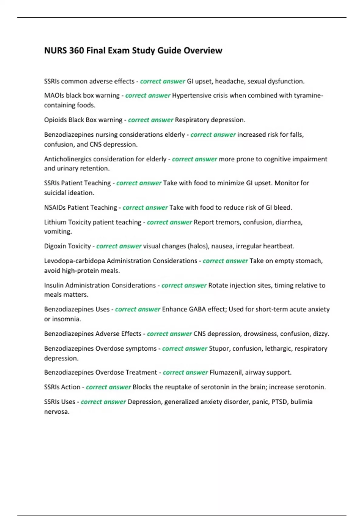 SSRIs common adverse effects - correct answer GI upset, headache, sexual dysfunction. MAOIs black box warning - correct answer Hypertensive crisis when combined with tyramine-containing foods. Opioids Black Box warning - correct answer Respiratory depression. Benzodiazepines nursing considerations elderly - correct answer increased risk for falls, confusion, and CNS depression. Anticholinergics consideration for elderly - correct answer more prone to cognitive impairment and urinary retention. SSRIs Patient Teaching - correct answer