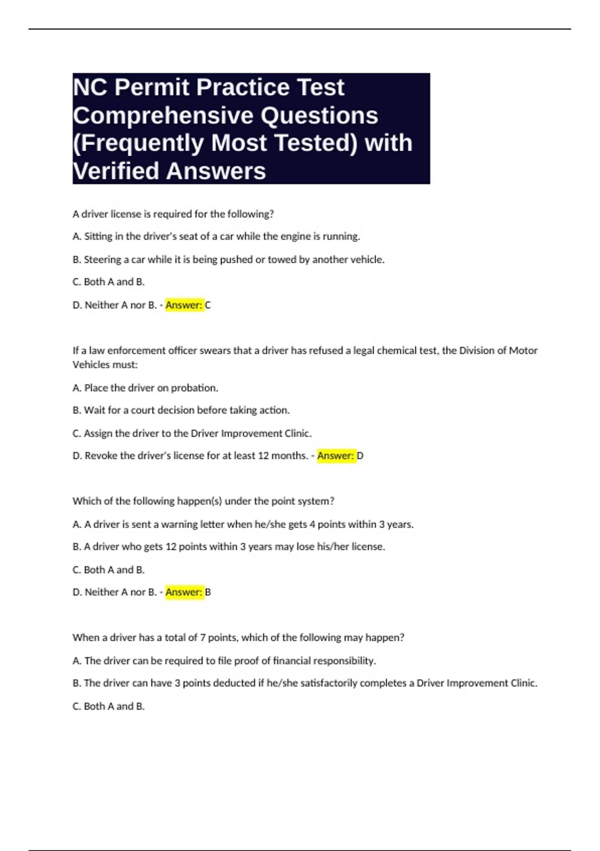NC Permit Practice Test Comprehensive Questions (Frequently Most Tested) with Verified Answers