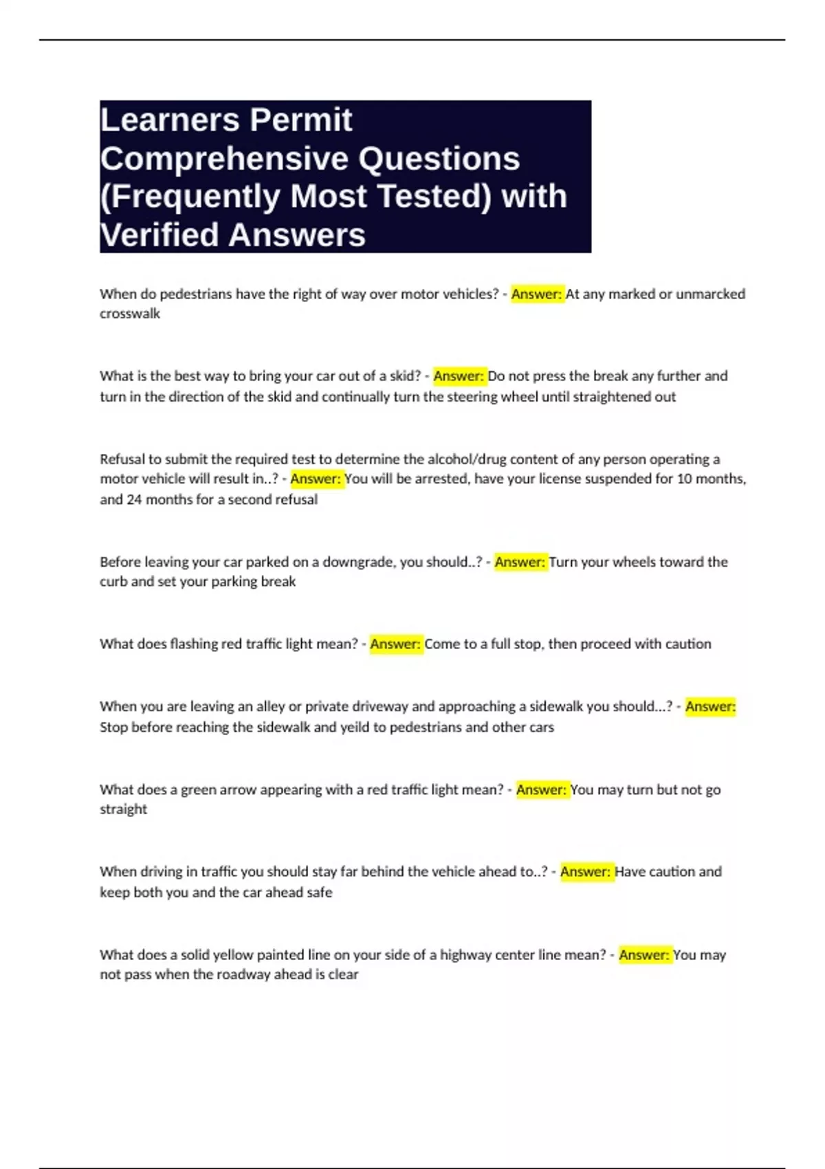 Learners Permit Comprehensive Questions (Frequently Most Tested) with Verified Answers.