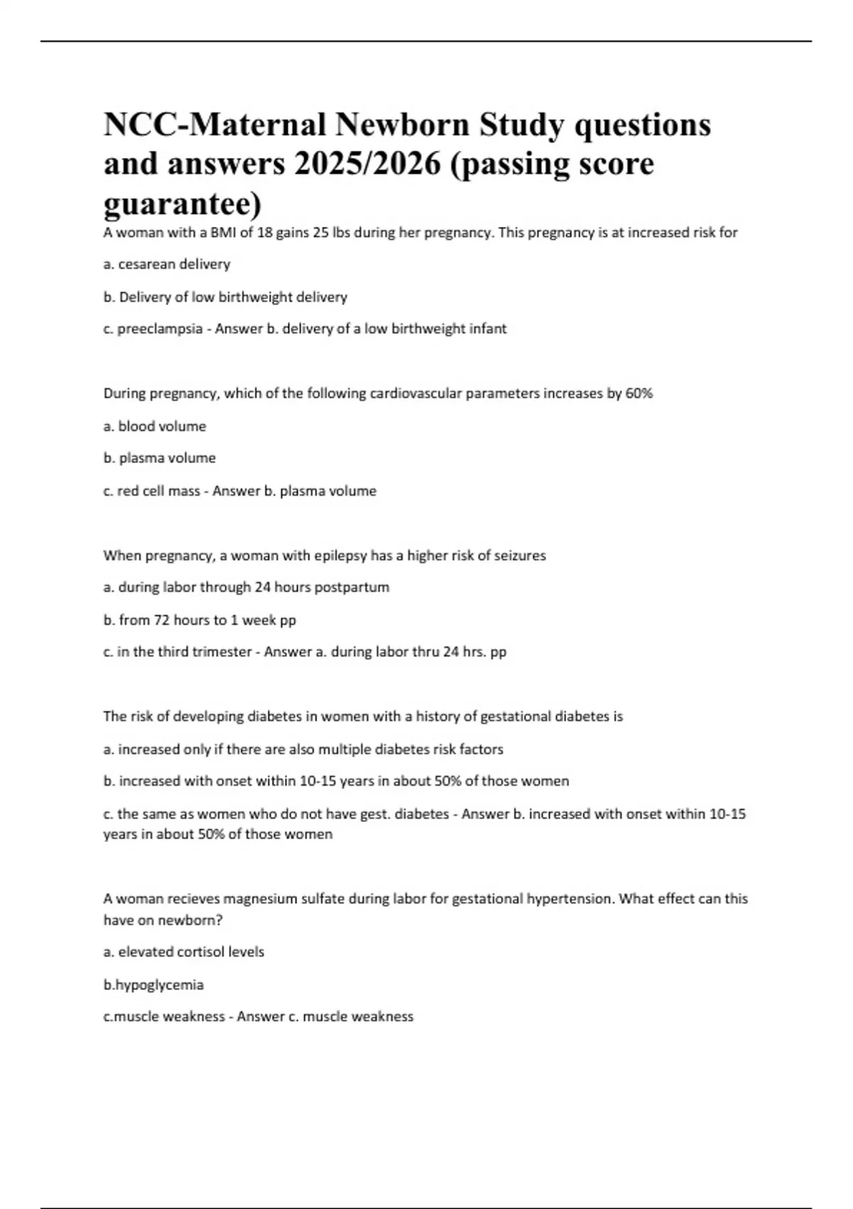 NCC Maternal Newborn Study Guide 2025/2026 Verified Questions and Answers – NCC Exam Success Resource