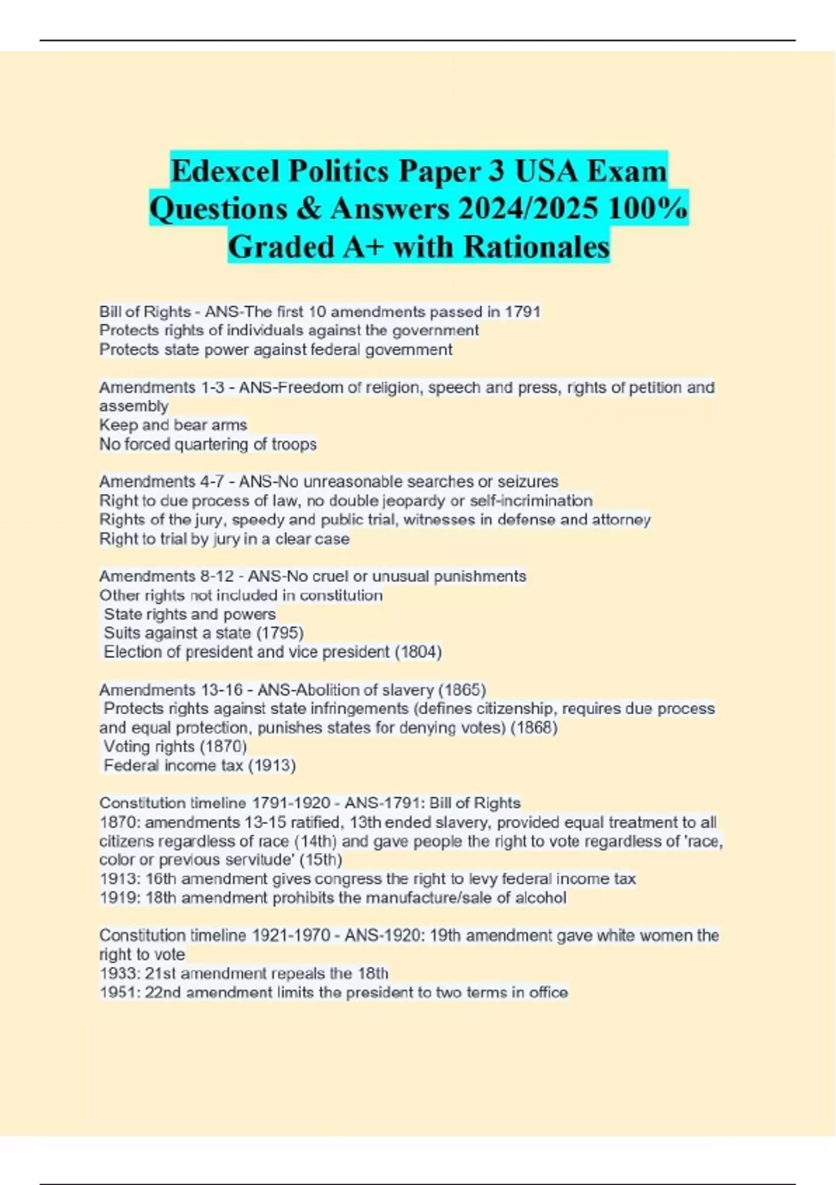 Edexcel Politics Paper 3 USA Exam Questions & Answers % Graded A+ with Rationales Bill of Rights - ANS-The first 10 amendments passed in 1791 Protects rights of individuals against the government Protects state power against federal government Amendments 1-3 - ANS-Freedom of religion, speech and press, rights of petition and assembly Keep and bear arms No forced quartering of troops Amendments 4-7 - ANS-No unreasonable searches or seizures Right to due process of law, no double jeopardy or self-incrimination Rights of the jury, speedy and public trial, witnesses in defense and attorney Right to trial by jury in a clear case Amendments 8-12 - ANS-No cruel or unusual punishments Other rights not included in constitution State rights and powers Suits against a state (1795) Election of president and vice president (1804) Amendments 13-16 - ANS-Abolition of slavery (1865) Protects rights against state infringements (defines citizenship, requires due process and equal protection, punishes states for denying votes) (1868) Voting rights (1870) Federal income tax (1913) Constitution timeline - ANS-1791: Bill of Rights 1870: amendments 13-15 ratified, 13th ended slavery, provided equal treatment to all citizens regardless of race (14th) and gave people the right to vote regardless of 'race, color or previous servitude' (15th) 1913: 16th amendment gives congress the right to levy federal income tax 1919: 18th amendment prohibits the manufacture/sale of alcohol Constitution timeline - ANS-1920: 19th amendment gave white women the right to vote 1933: 21st amendment repeals the 18th 1951: 22nd amendment limits the president to two terms in office 1967: 25th amendment allows the vice president to assume the office temporarily while a president is unable to fulfil their duties Affordable Care Act - ANS-Obama received a mandate for health care reform in 2008, yet was forced to abandon major aspects of his policy in light of opposition from congress, including democrats The elected house prevented an elected president from achieving his policies In 2014 republicans took control of the house and repealed health care, but it was vetoed by Obama Elections create democracy - ANS-Free and fair elections More elections = US citizens vote more than other countries 2 year house terms Elections do not create democracy - ANS-The electoral college is outdated and based on a reluctance to give power to the people Checks and Balances create democracy - ANS-Prevents one person / party / institution from holding all the power Can prevent corruption Ensure everyone's interests are considered Checks and balances do not create democracy - ANS-Democrats vote for democratic policies, republicans vote for republican policies 2012, voted for a democratic president who wanted comprehensive immigration reform but when in the house, the speaker blocked debates Rights Protection creates democracy - ANS-The bill of rights and 14th amendment give legal protection to Americans Protect certain powers the people have, giving them the ability to have influence over the government Rights protection does not create democracy - ANS-Shelby ruling has allowed states to created laws that undermine the opportunity for poor/minority voters to participate If voters choose to vote for politicians with dodgy policies (voter ID) then they should be allowed to carry them out Enumerated powers - ANS-set out clearly Implied powers - ANS-not expressly set down Courts powers - enumerated - ANS-Rule on cases arising under the constitution, the laws of the United States or treaties Courts powers - Implied - ANS-The power of judicial review Congress' powers - enumerated - ANS-Collection of taxes and duties Borrowing money on behalf of the United States Organizing, training and army a militia Exclusive powers to legislate matters of the country Establishing courts that are subordinate to the supreme court Declaration of war Amendment of the constitution (shared with the states) Raise income tax Congress' powers - implied - ANS-The interstate commerce clause The necessary and proper clause Necessary and proper clause - ANS-congress has the power to make all laws which shall be necessary and proper for carrying into the execution of the foregoing powers Presidential powers - enumerated - ANS-Nominates cabinet members, ambassadors and the judiciary Heads the executive branch Vetoes legislation Grants pardons Proposes measures to congress Presidential powers - implied - ANS-Commander in chief of the armed forces Problems due to constitutional vagueness - Constitution could fail to regulate political practice - ANS-Vagueness can undermine constitution and supreme court authority as people reject newly established rulings or political practices Problems due to constitutional vagueness - The supreme court could become too powerful - ANS-Vagueness allows individual justices to apply their own ideologies when ruling on a case Unelected Problems due to constitutional vagueness - There could be significant conflict - ANS-Lack of clarity leads to strong disputes, with each side claiming to base their view is more legitimate, often based on ideologies, leads to further divides Amendment Proposal - ANS-Amendment is proposed by ⅔ vote of each house of congress Amendment is proposed by a national convention called by congress at the request of ⅔ of state legislators Ratification Process - ANS-Amendment is ratified by ¾ vote of the state legislators Amendment is ratified by ¾ of the state conventions Continues...