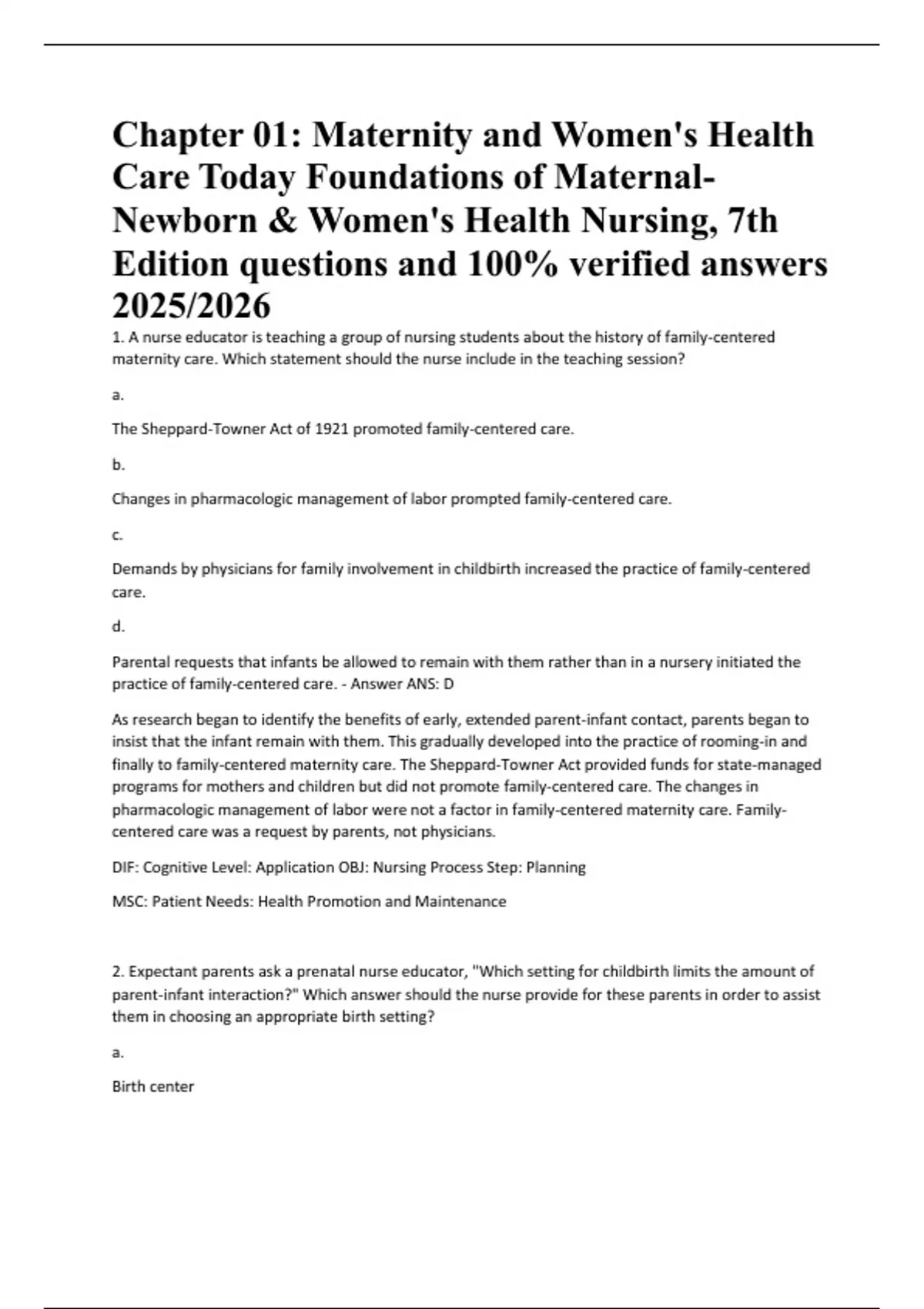 This expertly crafted Chapter 01 study guide from the Foundations of Maternal-Newborn & Women’s Health Nursing, 7th Edition provides 100% verified questions and answers for nursing students preparing for exams, quizzes, NCLEX, or classroom assessments in maternity care. What’s Inside: Historical context of maternity nursing Family-centered care models and birthing settings Evidence-based nursing interventions Labor & delivery nursing priorities Advanced nursing roles (CNS, CNM, NNP) Patient communication, documentation, and care planning Critical thinking and delegation in maternity settings Complementary & alternative therapies in maternal care Magnet hospitals and healthcare system developments Aligned with 2025/2026 curriculum standards Based on Foundations of Maternal-Newborn Nursing, Ricci 7th Edition Ideal for BSN, ADN, LPN, RN, or NCLEX-RN/PN candidates Structured in Q&A format for easy learning & memorization Perfect for pre-exam review, self-testing, or group study sessions — this resource is your go-to foundation for success in Maternity and Women's Health Nursing.