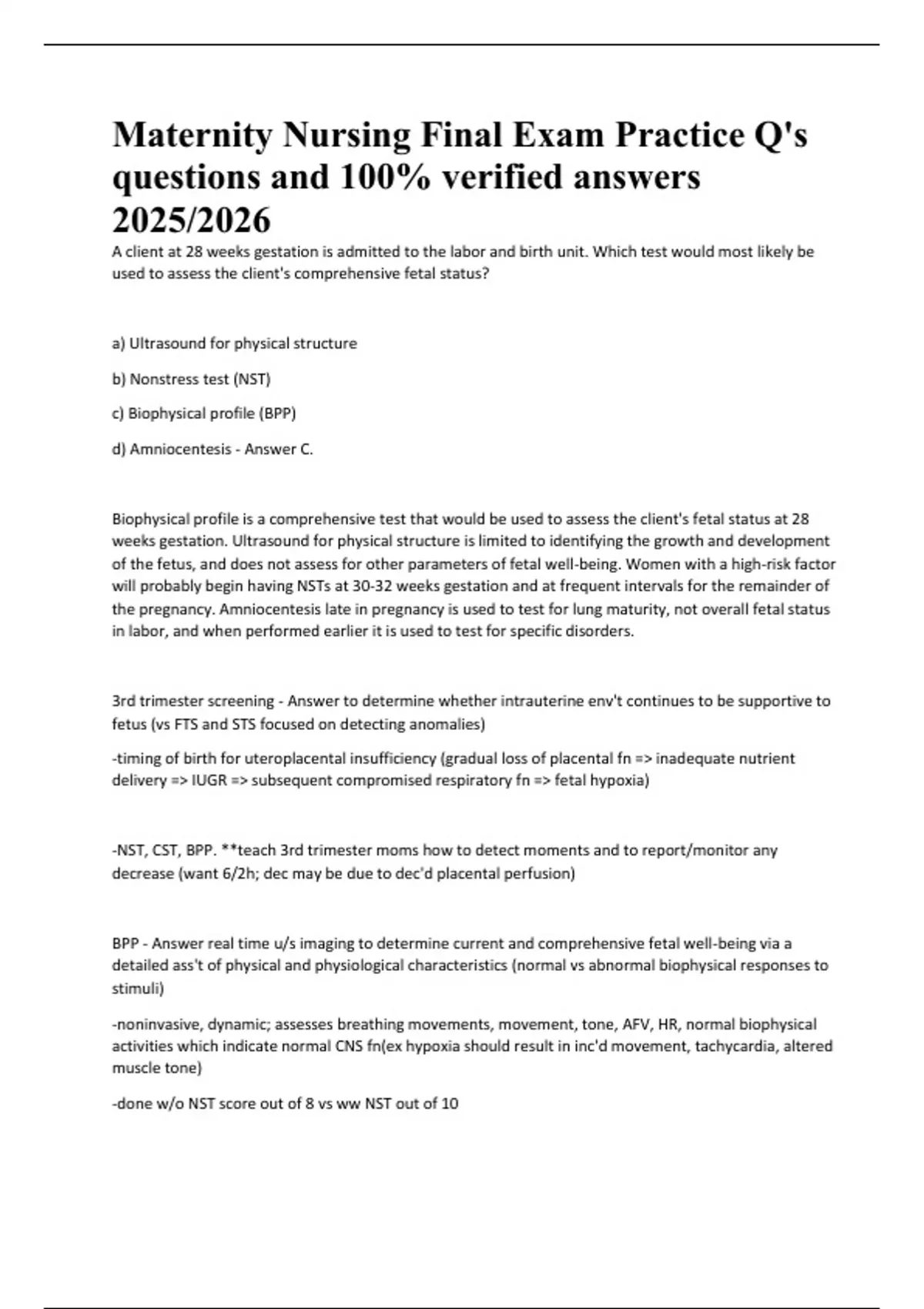 Biophysical profile is a comprehensive test that would be used to assess the client's fetal status at 28