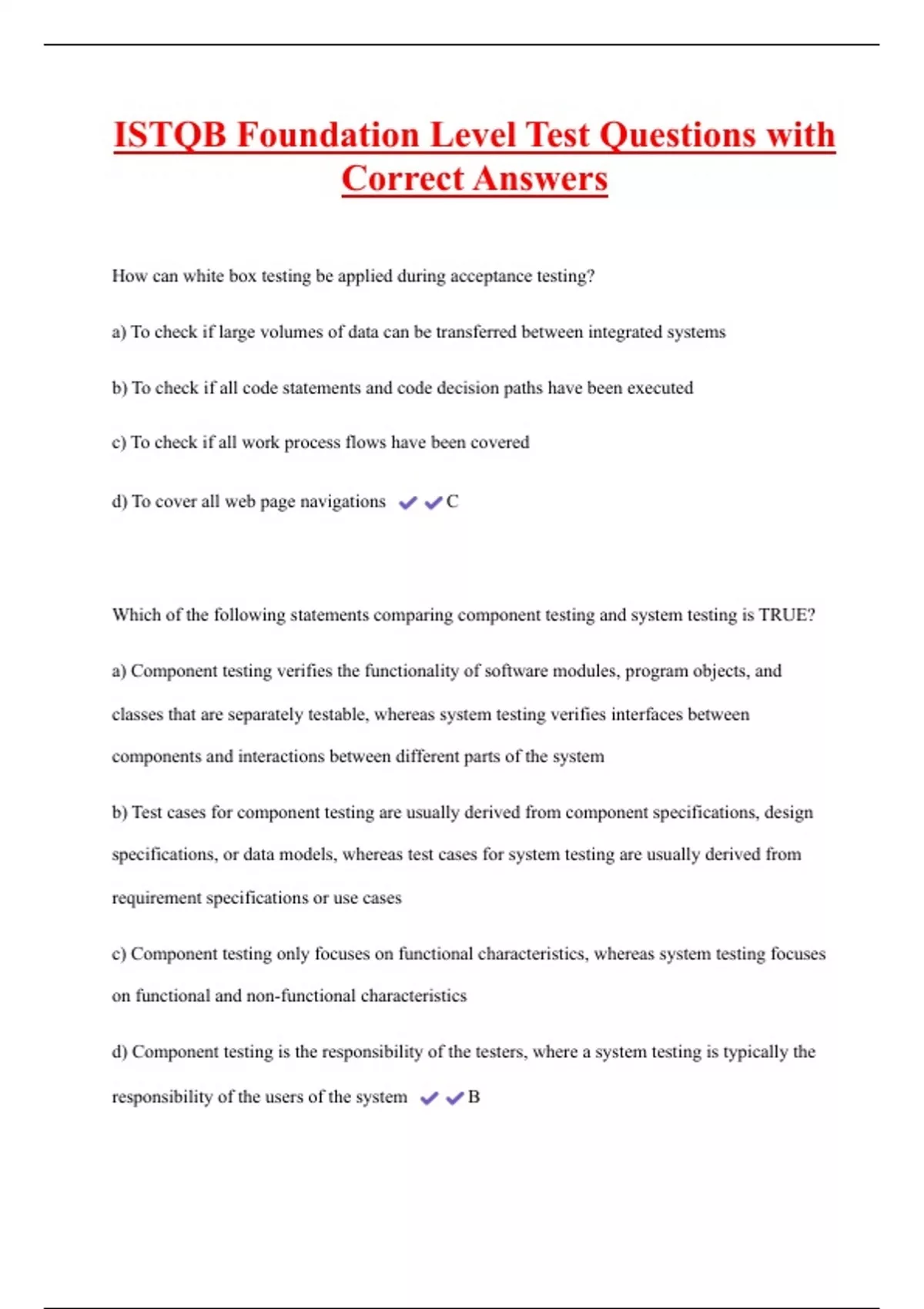 b) Test cases for component testing are usually derived from component specifications, design