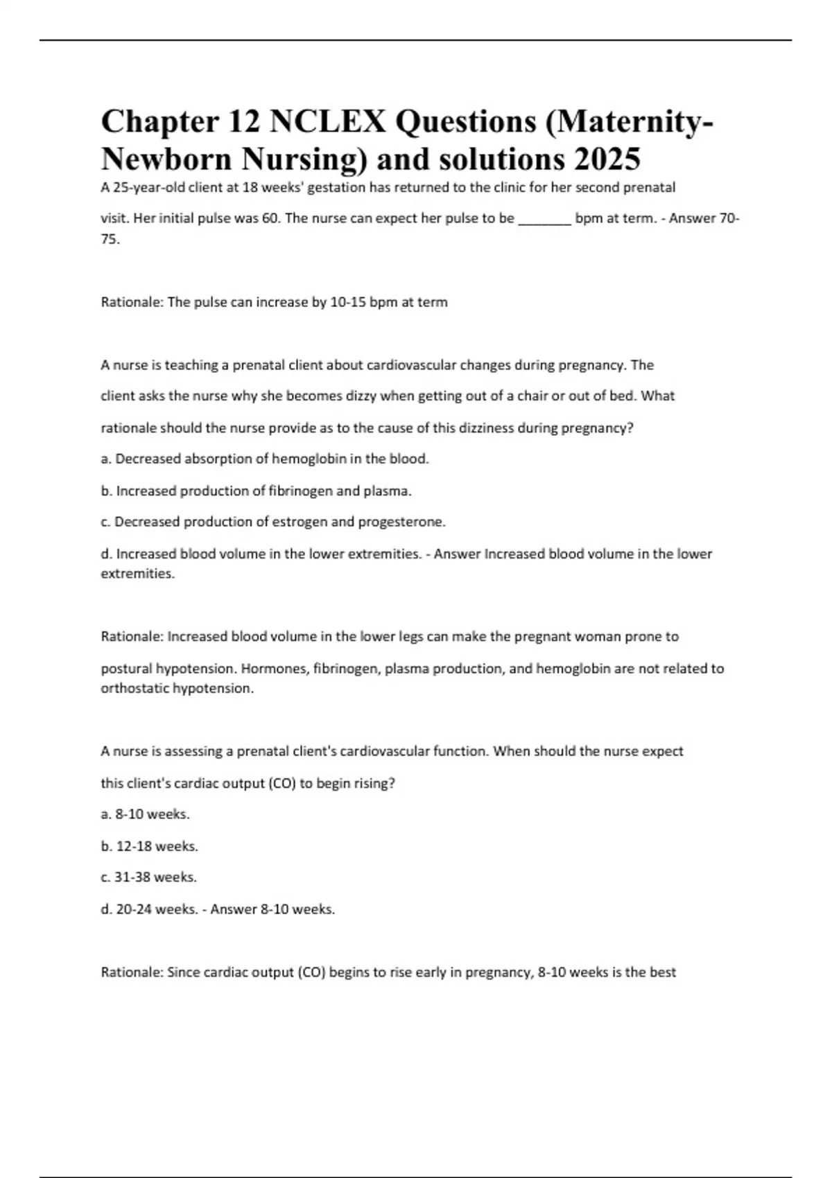 Are you confident in answering NCLEX-style maternity questions about pregnancy signs, cardiovascular adaptations, uteroplacental circulation, and first-trimester client education? This comprehensive review guide based on Chapter 12 of Maternity and Newborn Nursing features realistic NCLEX-style questions and detailed rationales tailored for 2025/2026 nursing students. Each question is mapped to key clinical concepts frequently tested in exams and licensing boards. Whether you’re prepping for an upcoming maternity nursing exam or reviewing for the NCLEX-RN or NCLEX-PN, this resource helps you master the physiological, psychosocial, and diagnostic aspects of prenatal care.