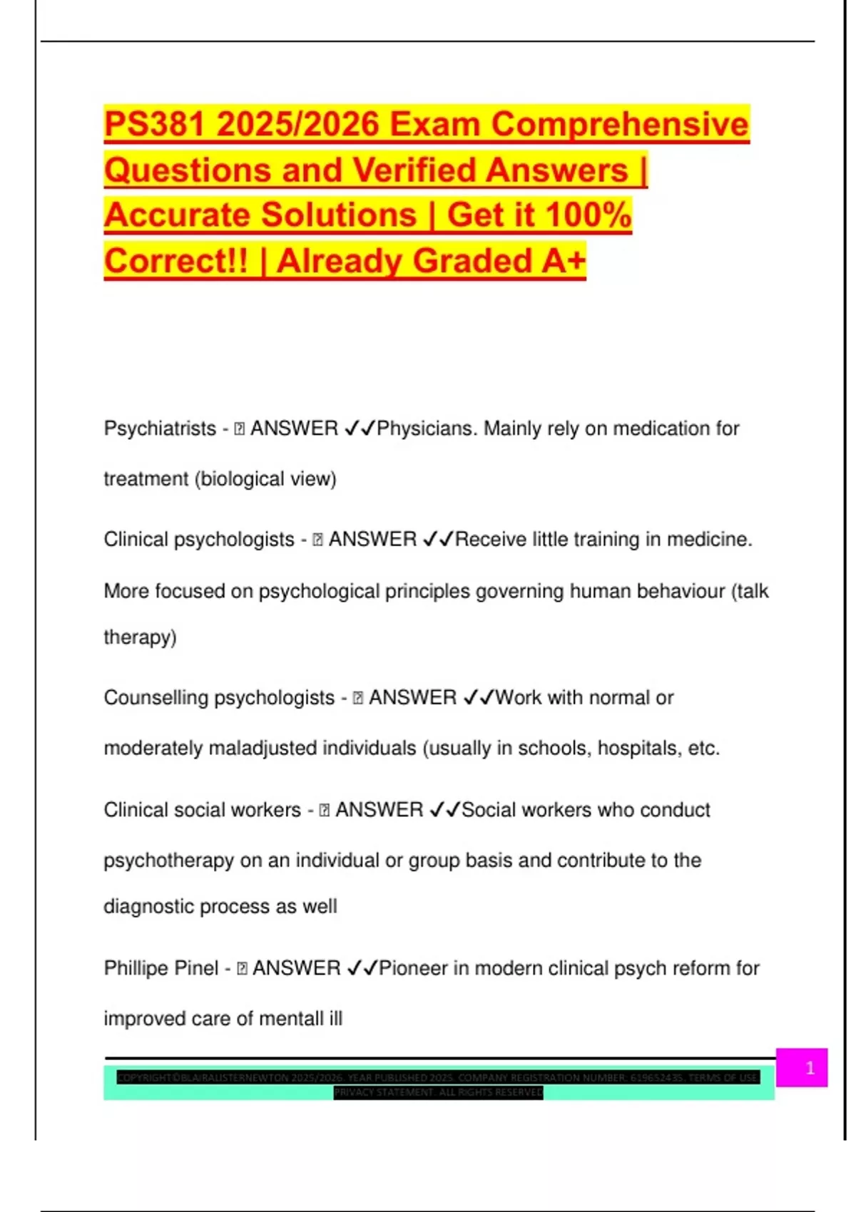 Phillipe Pinel - 🧠 ANSWER ✔✔Pioneer in modern clinical psych reform for