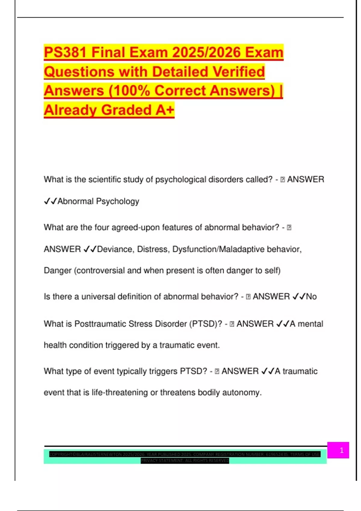 PS381 Final Exam 2025/2026 Exam Questions with Detailed Verified Answers (100% Correct Answers) | Already Graded A+ What is the scientific study of psychological disorders called? -