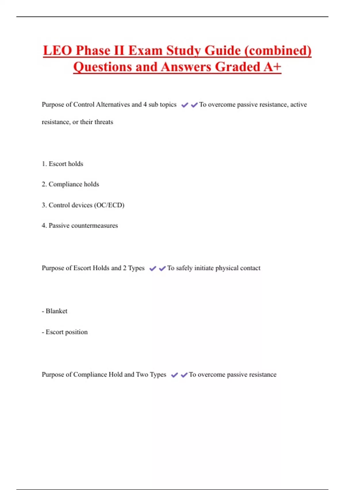 LEO Phase II Exam Study Guide (combined) Questions and Answers Graded A+ Purpose of Control Alternatives and 4 sub topics To overcome passive resistance, active resistance, or their threats 1. Escort holds 2. Compliance holds 3. Control devices (OC/ECD) 4. Passive countermeasures Purpose of Escort Holds and 2 Types To safely initiate physical contact - Blanket - Escort position