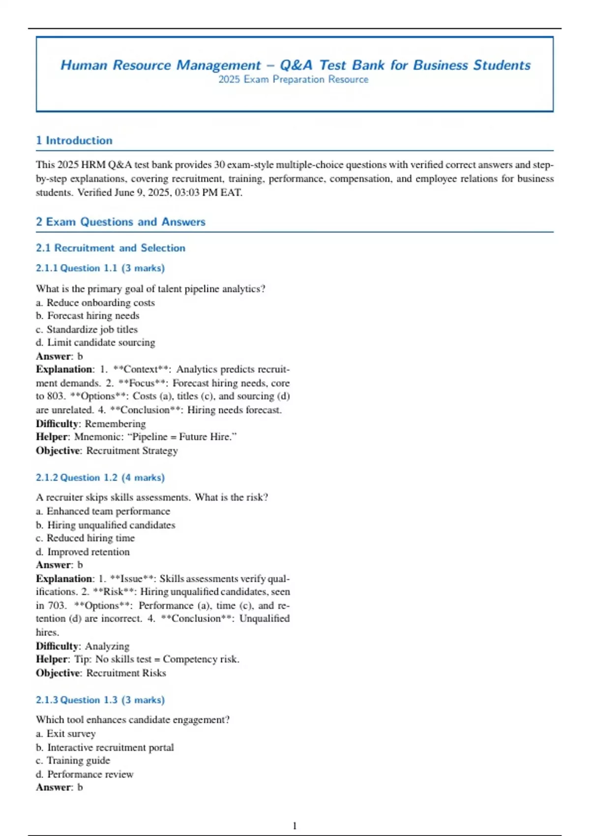 Human Resource Management– Q&A Test Bank for Business Students 2025 Exam Preparation Resource 1 Introduction This 2025 HRMQ&Atestbankprovides30exam-style multiple-choice questions with verified correct answers and step by-step explanations, covering recruitment, training, performance, compensation, and employee relations for business students.