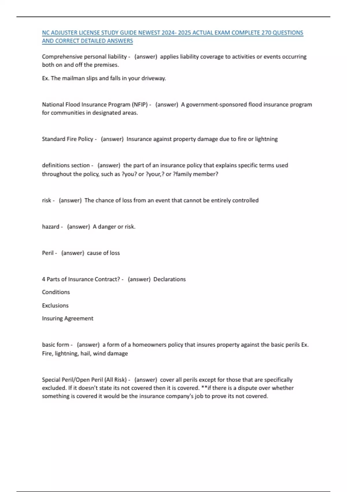 NC ADJUSTER LICENSE STUDY GUIDE NEWEST ACTUAL EXAM COMPLETE 270 QUESTIONS AND CORRECT DETAILED ANSWERS
