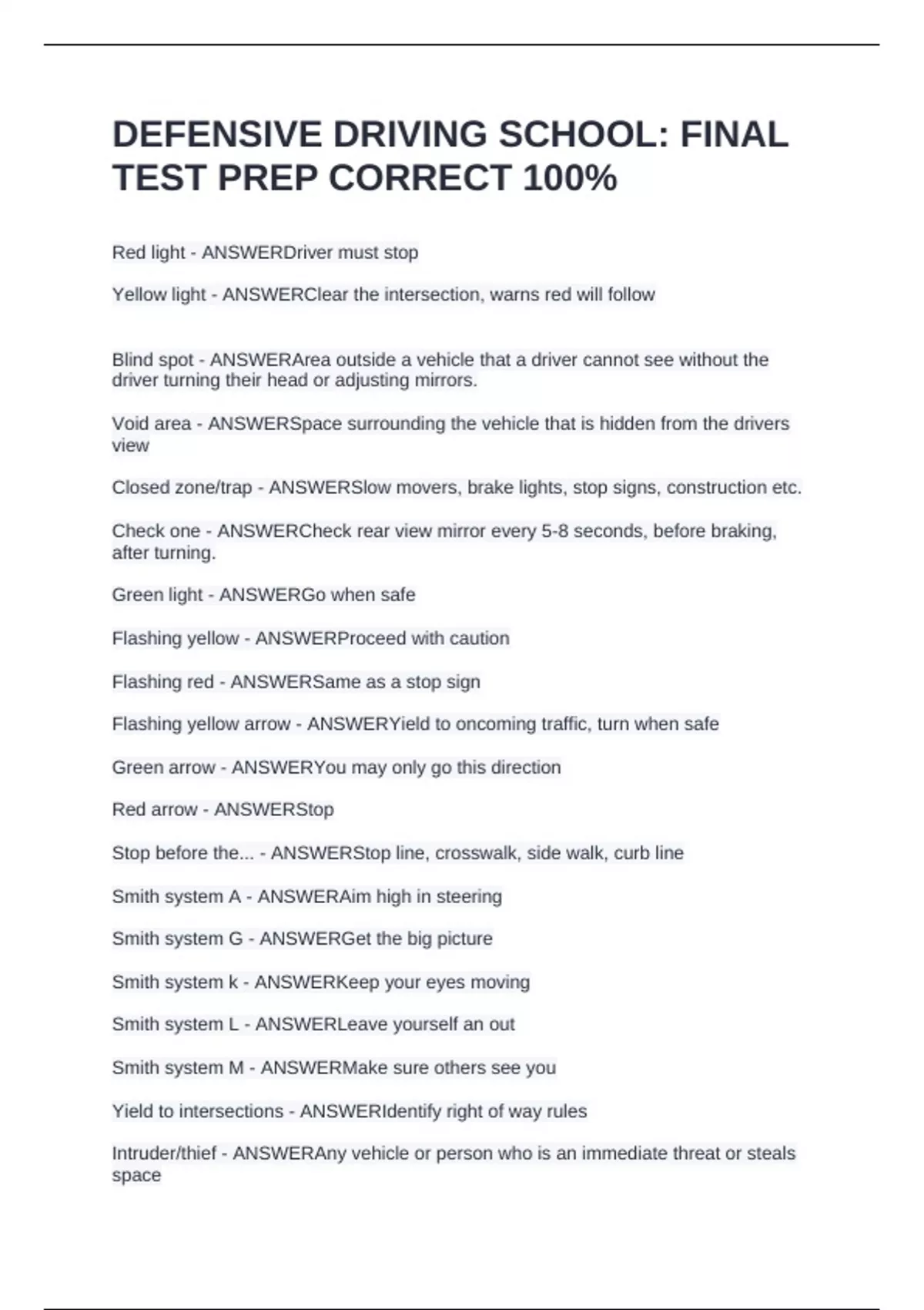 Red light - ANSWERDriver must stop Yellow light - ANSWERClear the intersection, warns red will follow Blind spot - ANSWERArea outside a vehicle that a driver cannot see without the driver turning their head or adjusting mirrors. Void area - ANSWERSpace surrounding the vehicle that is hidden from the drivers view Closed zone/trap - ANSWERSlow movers, brake lights, stop signs, construction etc. Check one - ANSWERCheck rear view mirror every 5-8 seconds, before braking, after turning. Green light - ANSWERGo when safe Flashing yellow - ANSWERProceed with caution Flashing red - ANSWERSame as a stop sign Flashing yellow arrow - ANSWERYield to oncoming traffic, turn when safe Green arrow - ANSWERYou may only go this direction Red arrow - ANSWERStop Stop before the... - ANSWERStop line, crosswalk, side walk, curb line Smith system A - ANSWERAim high in steering