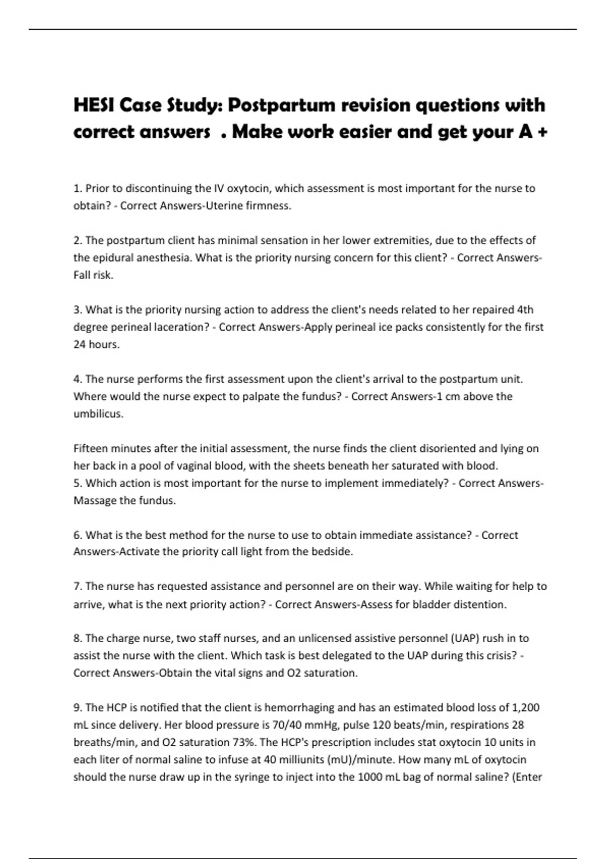 1. Prior to discontinuing the IV oxytocin, which assessment is most important for the nurse to