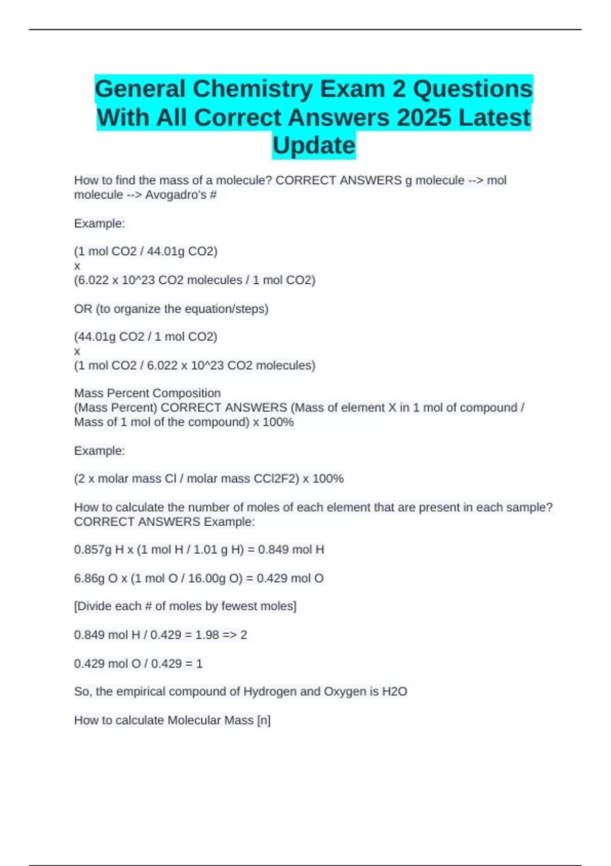 (Mass Percent) CORRECT ANSWERS (Mass of element X in 1 mol of compound /