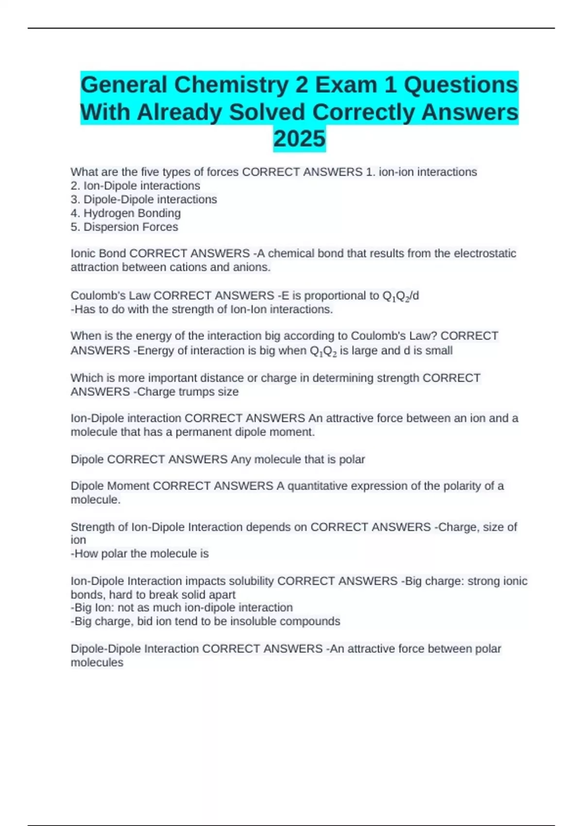 General Chemistry 2 Exam 1 Questions With Already Solved Correctly Answers 2025