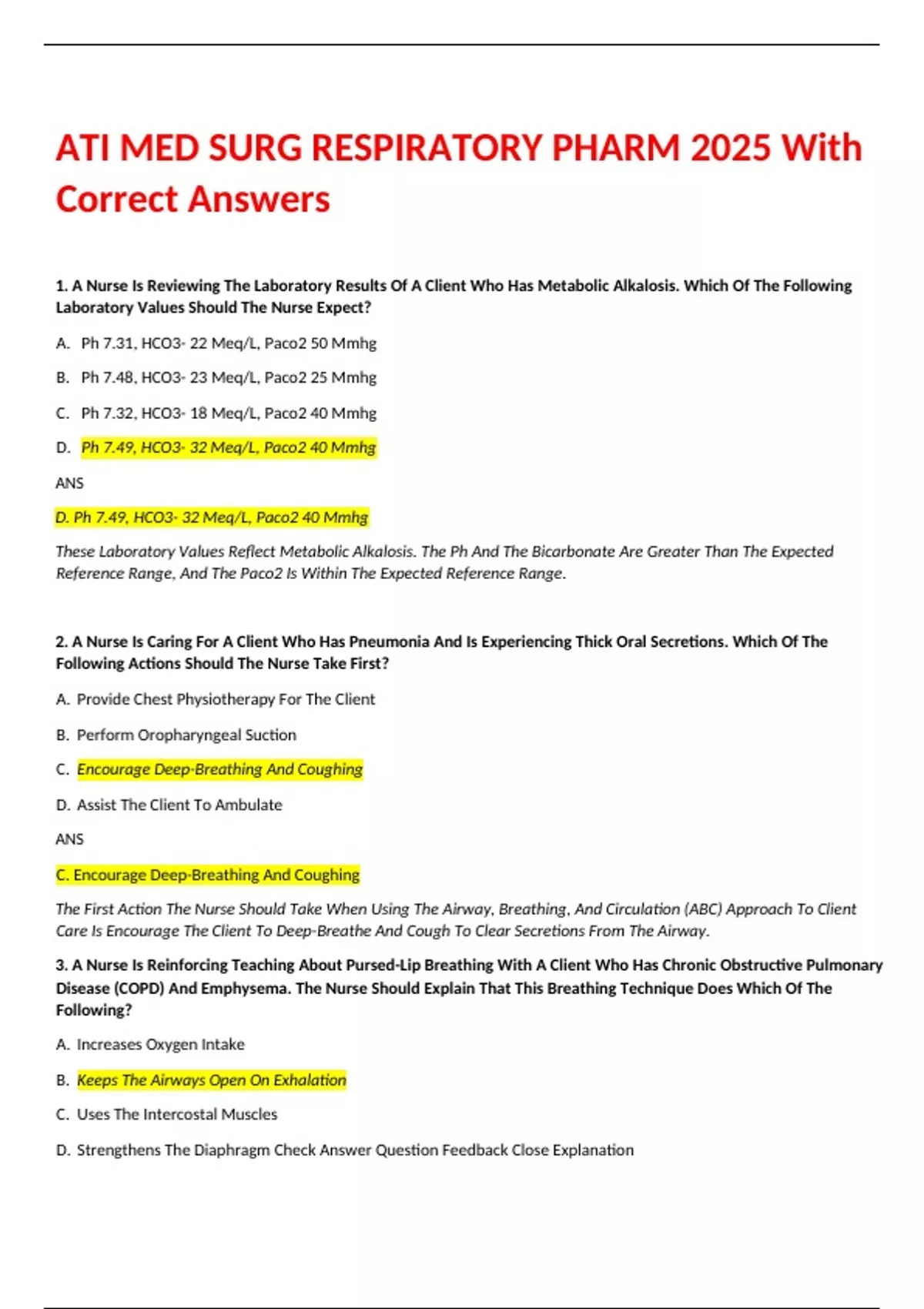 1. A Nurse Is Reviewing The Laboratory Results Of A Client Who Has Metabolic Alkalosis. Which Of The Following