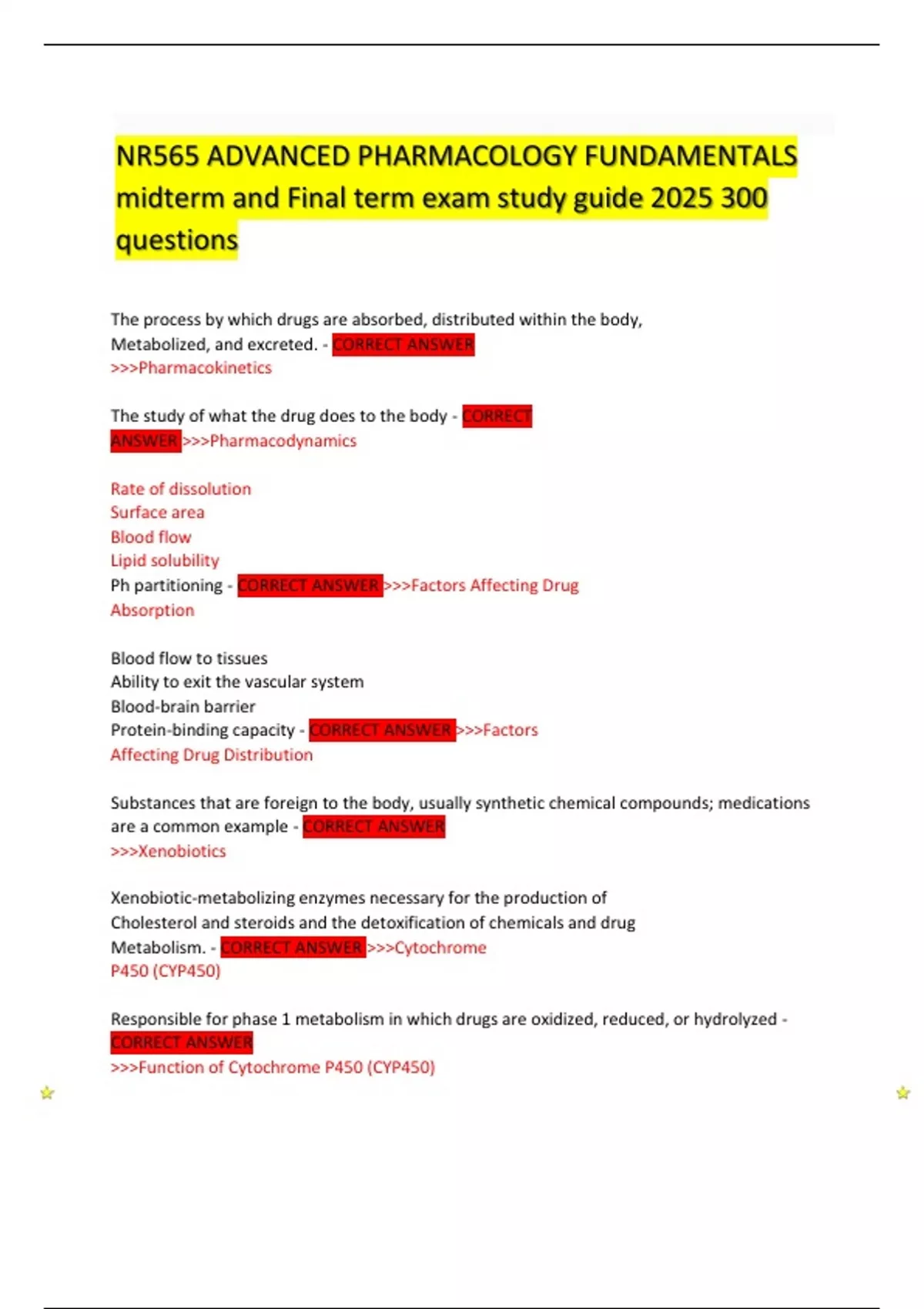NR565 ADVANCED PHARMACOLOGY FUNDAMENTALS midterm and Final term exam study guide 2025 300 questions The process by which drugs are absorbed, distributed within the body, Metabolized, and excreted. - CORRECT ANSWER >>>Pharmacokinetics The study of what the drug does to the body - CORRECT ANSWER >>>Pharmacodynamics Rate of dissolution Surface area Blood flow Lipid solubility Ph partitioning - CORRECT ANSWER >>>Factors Affecting Drug Absorption Blood flow to tissues Ability to exit the vascular system Blood-brain barrier Protein-binding capacity - CORRECT ANSWER >>>Factors Affecting Drug Distribution