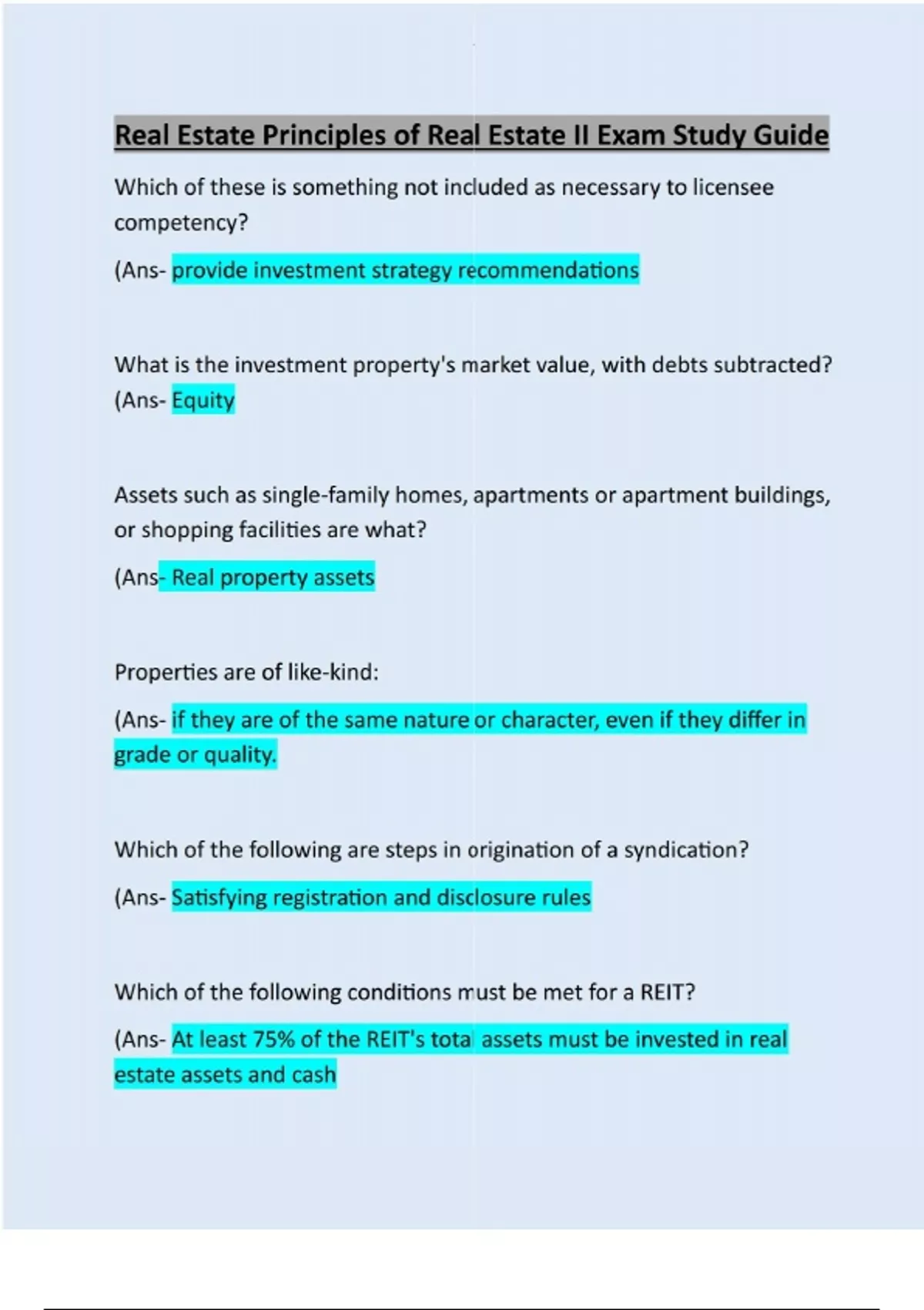 Which of these is something not included as necessary to licensee competency? (Ans- provide investment strategy recommendations What is the investment property's market value, with debts subtracted? (Ans- Equity Assets such as single-family homes, apartments or apartment buildings, or shopping facilities are what? (Ans- Real property assets Properties are of like-kind: (Ans- if they are of the same nature or character, even if they differ in grade or quality. Which of the following are steps in origination of a syndication? (Ans- Satisfying registration and disclosure rules Which of the following conditions must be met for a REIT? (Ans- At least 75% of the REIT's total assets must be invested in real estate assets and cashWhere are investment products like REMICs traded? (Ans- Stock market If a commercial landlord has locked a tenant out of leased premises in violation of Section 93.002, the tenant: (Ans- may recover possession of the premises as provided by section 93.003. A leasehold that continues for a definite period of time, which can be anywhere from weeks, to months, to years at a time is: (Ans- An estate for years. What type of clause would the