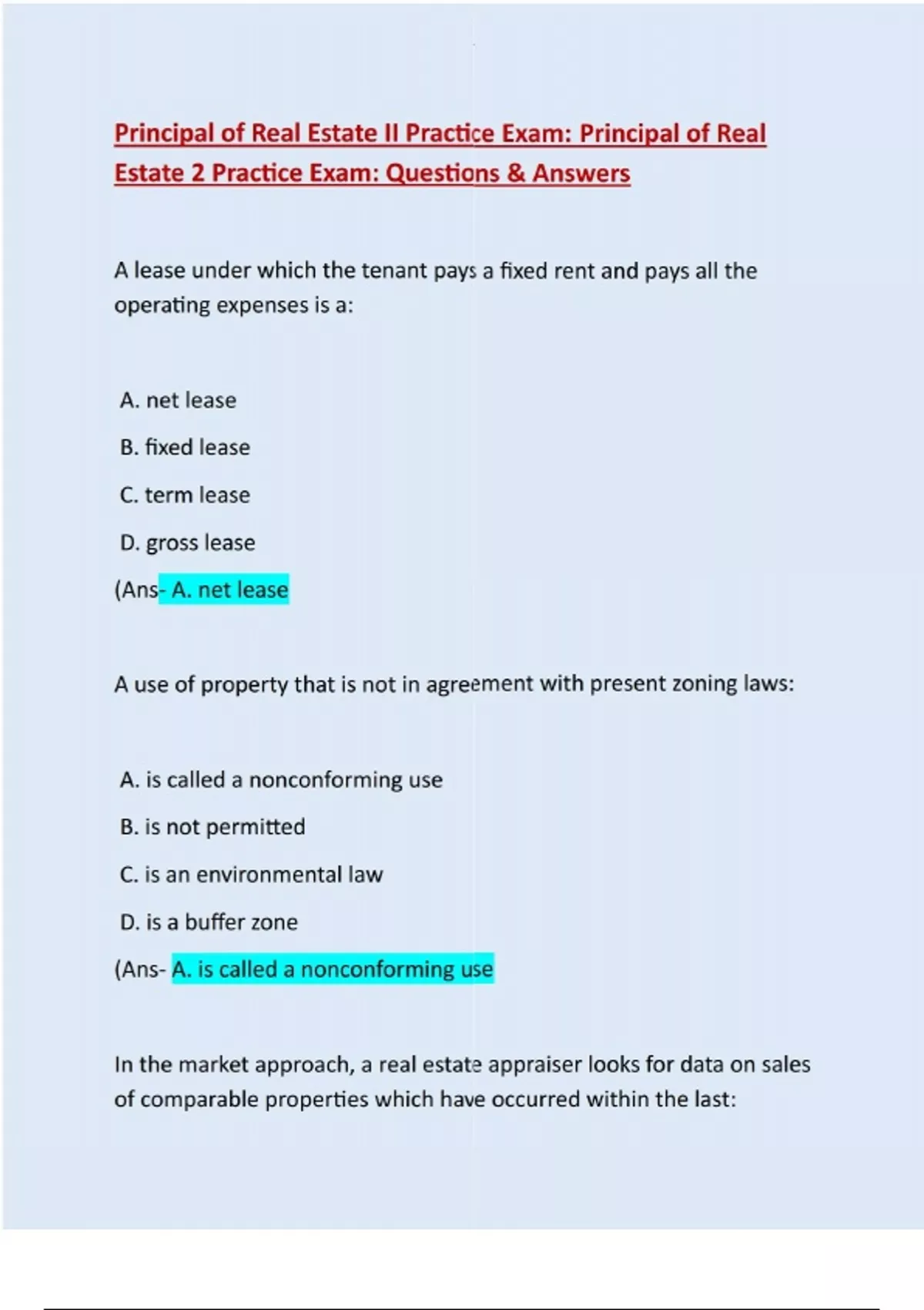 A lease under which the tenant pays a fixed rent and pays all the operating expenses is a: A. net lease B. fixed lease C. term lease D. gross lease (Ans- A. net lease A use of property that is not in agreement with present zoning laws: A. is called a nonconforming use B. is not permitted C. is an environmental law D. is a buffer zone (Ans- A. is called a nonconforming use In the market approach, a real estate appraiser looks for data on sales of comparable properties which have occurred within the last:A. six months B. ten days C. year D. 30 days (Ans- A. six months An FHA loan is a loan that is _______________ by the Federal Housing Administration. A. insured B. guaranteed C. bonded D. not allowed (Ans- A. insured Within a condominium development, common elements are owned by: A. the owner's association B. all unit owners who hold undivided interests in the elements C. the condominium developerD. individual unit owners as community property (Ans- B. all unit owners who hold undivided interests in the elements At closing the following are prorated: A. taxes B. interest C. rents D. all of the above (Ans- D. all of the above