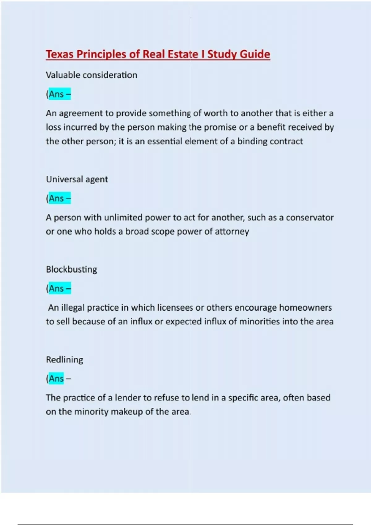 Texas Principles of Real Estate I Study Guide: Questions & Answers: Latest Updated Solution