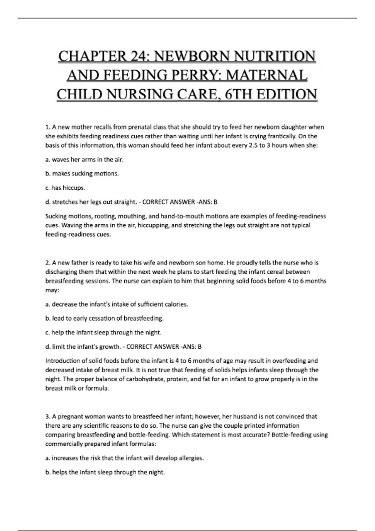 CHAPTER 24: NEWBORN NUTRITION AND FEEDING PERRY: MATERNAL CHILD NURSING CARE, 6TH EDITION 1. A new mother recalls from prenatal class that she should try to feed her newborn daughter when she exhibits feeding readiness cues rather than waiting until her infant is crying frantically. On the basis of this information, this woman should feed her infant about every 2.5 to 3 hours when she: a. waves her arms in the air. b. makes sucking motions. c. has hiccups. d. stretches her legs out straight. - CORRECT ANSWER -ANS: B Sucking motions, rooting, mouthing, and hand-to-mouth motions are examples of feeding-readiness cues. Waving the arms in the air, hiccupping, and stretching the legs out straight are not typical feeding-readiness cues. 2. A new father is ready to take his wife and newborn son home. He proudly tells the nurse who is discharging them that within the next week he plans to start feeding the infant cereal between breastfeeding sessions. The nurse can explain to him that beginning solid foods before 4 to 6 months may: a. decrease the infant's intake of sufficient calories. b. lead to early cessation of breastfeeding. c. help the infant sleep through the night. d. limit the infant's growth. - CORRECT ANSWER -ANS: B Introduction of solid foods before the infant is 4 to 6 months of age may result in overfeeding and decreased intake of breast milk. It is not true that feeding of solids helps infants sleep through the night. The proper balance of carbohydrate, protein, and fat for an infant to grow properly is in the breast milk or formula. 3. A pregnant woman wants to breastfeed her infant; however, her husband is not convinced that there are any scientific reasons to do so. The nurse can give the couple printed information comparing breastfeeding and bottle-feeding. Which statement is most accurate? Bottle-feeding using commercially prepared infant formulas: a. increases the risk that the infant will develop allergies. b. helps the infant sleep through the night. c. ensures that the infant is getting iron in a form that is easily absorbed.