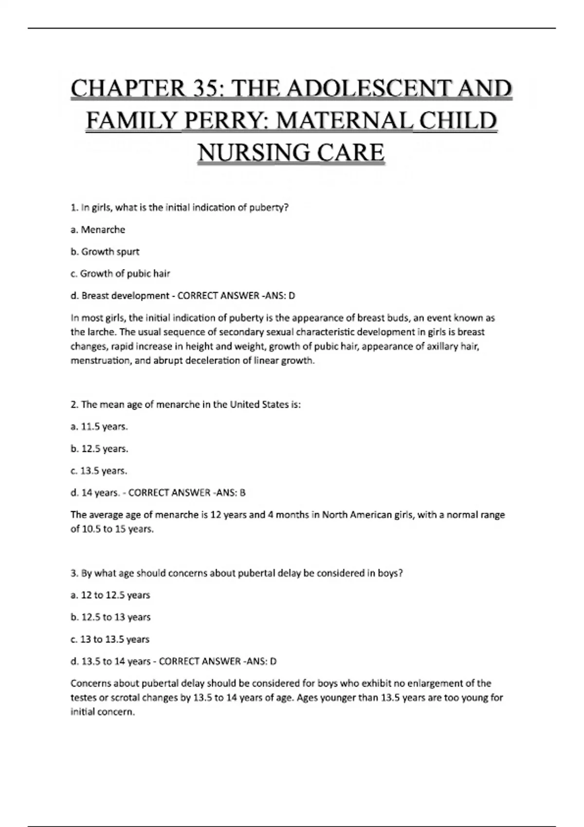 CHAPTER 35: THE ADOLESCENT AND FAMILY PERRY: MATERNAL CHILD NURSING CARE 1. In girls, what is the initial indication of puberty? a. Menarche b. Growth spurt c. Growth of pubic hair d. Breast development - CORRECT ANSWER -ANS: D In most girls, the initial indication of puberty is the appearance of breast buds, an event known as the larche. The usual sequence of secondary sexual characteristic development in girls is breast changes, rapid increase in height and weight, growth of pubic hair, appearance of axillary hair, menstruation, and abrupt deceleration of linear growth. 2. The mean age of menarche in the United States is: a. 11.5 years. b. 12.5 years. c. 13.5 years. d. 14 years. - CORRECT ANSWER -ANS: B The average age of menarche is 12 years and 4 months in North American girls, with a normal range of 10.5 to 15 years. 3. By what age should concerns about pubertal delay be considered in boys? a. 12 to 12.5 years b. 12.5 to 13 years c. 13 to 13.5 years d. 13.5 to 14 years - CORRECT ANSWER -ANS: D Concerns about pubertal delay should be considered for boys who exhibit no enlargement of the testes or scrotal changes by 13.5 to 14 years of age. Ages younger than 13.5 years are t