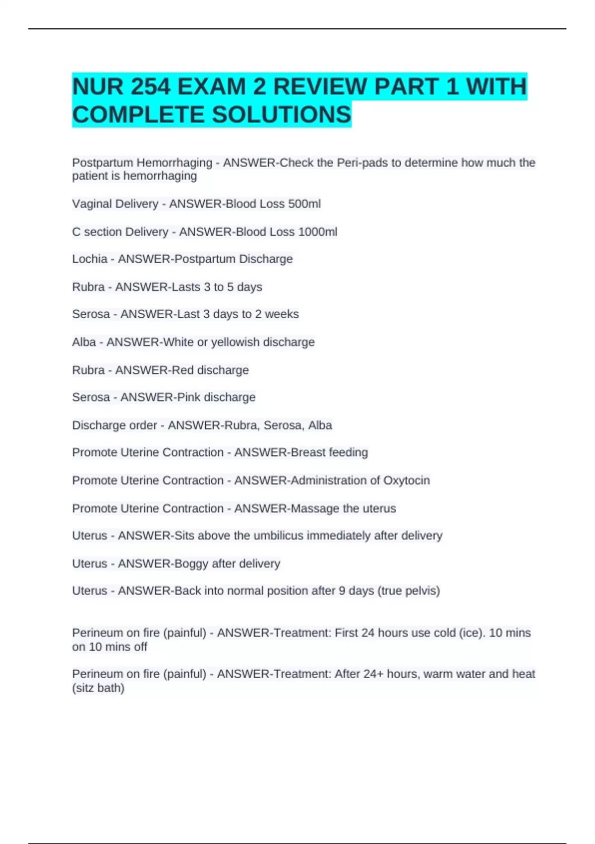 NUR 254 EXAM 2 REVIEW PART 1 WITH COMPLETE SOLUTIONSNUR 254 EXAM 2 REVIEW PART 1 WITH COMPLETE SOLUTIONSNUR 254 EXAM 2 REVIEW PART 1 WITH COMPLETE SOLUTIONS Postpartum Hemorrhaging - ANSWER-Check the Peri-pads to determine how much the patient is hemorrhaging Vaginal Delivery - ANSWER-Blood Loss 500ml C section Delivery - ANSWER-Blood Loss 1000ml Lochia - ANSWER-Postpartum Discharge