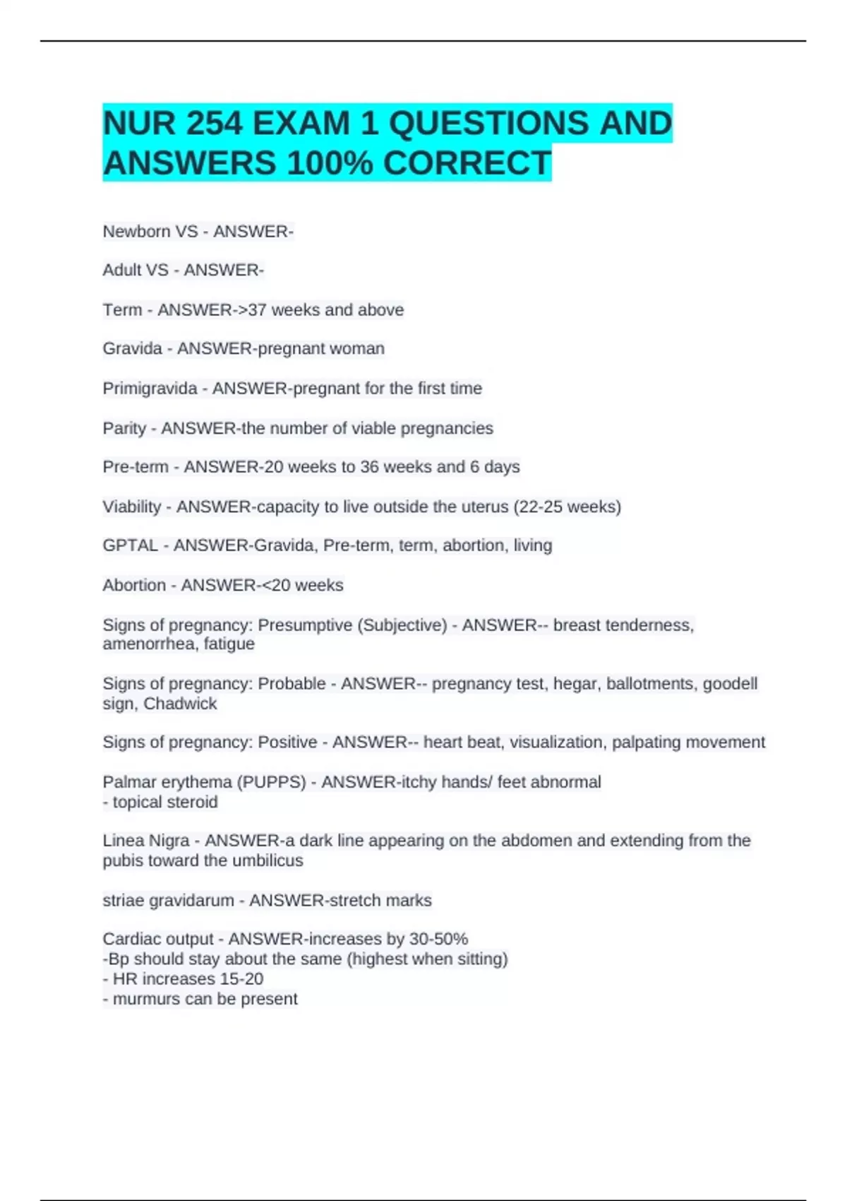 NUR 254 EXAM 1 QUESTIONS AND ANSWERS 100% CORRECTNUR 254 EXAM 1 QUESTIONS AND ANSWERS 100% CORRECTNUR 254 EXAM 1 QUESTIONS AND ANSWERS 100% CORRECT Newborn VS - ANSWER- Adult VS - ANSWER- Term - ANSWER->37 weeks and above Gravida - ANSWER-pregnant woman
