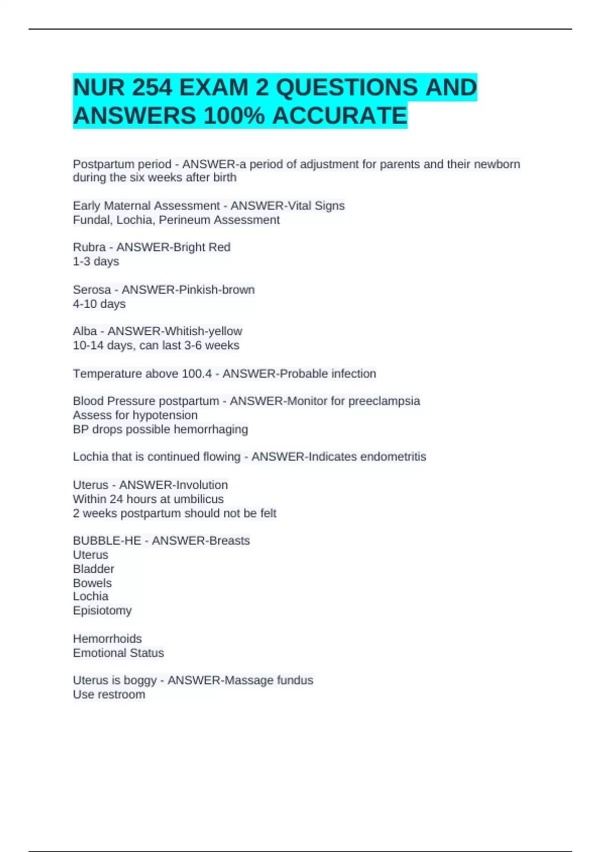 NUR 254 EXAM 2 QUESTIONS AND ANSWERS 100% ACCURATENUR 254 EXAM 2 QUESTIONS AND ANSWERS 100% ACCURATENUR 254 EXAM 2 QUESTIONS AND ANSWERS 100% ACCURATENUR 254 EXAM 2 QUESTIONS AND ANSWERS 100% ACCURATE Postpartum period - ANSWER-a period of adjustment for parents and their newborn during the six weeks after birth Early Maternal Assessment - ANSWER-Vital Signs Fundal, Lochia, Perineum Assessment Rubra - ANSWER-Bright Red 1-3 days Serosa - ANSWER-Pinkish-brown 4-10 days