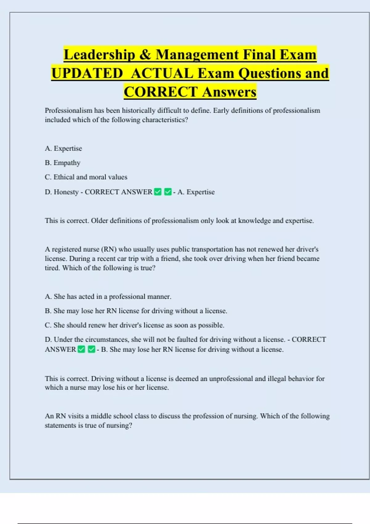 Leadership & Management Final Exam UPDATED ACTUAL Exam Questions and CORRECT Answers Professionalism has been historically difficult to define. Early definitions of professionalism included which of the following characteristics? A. Expertise B. Empathy C. Ethical and moral values D. Honesty - CORRECT ANSWER - A. Expertise This is correct. Older definitions of professionalism only look at knowledge and expertise
