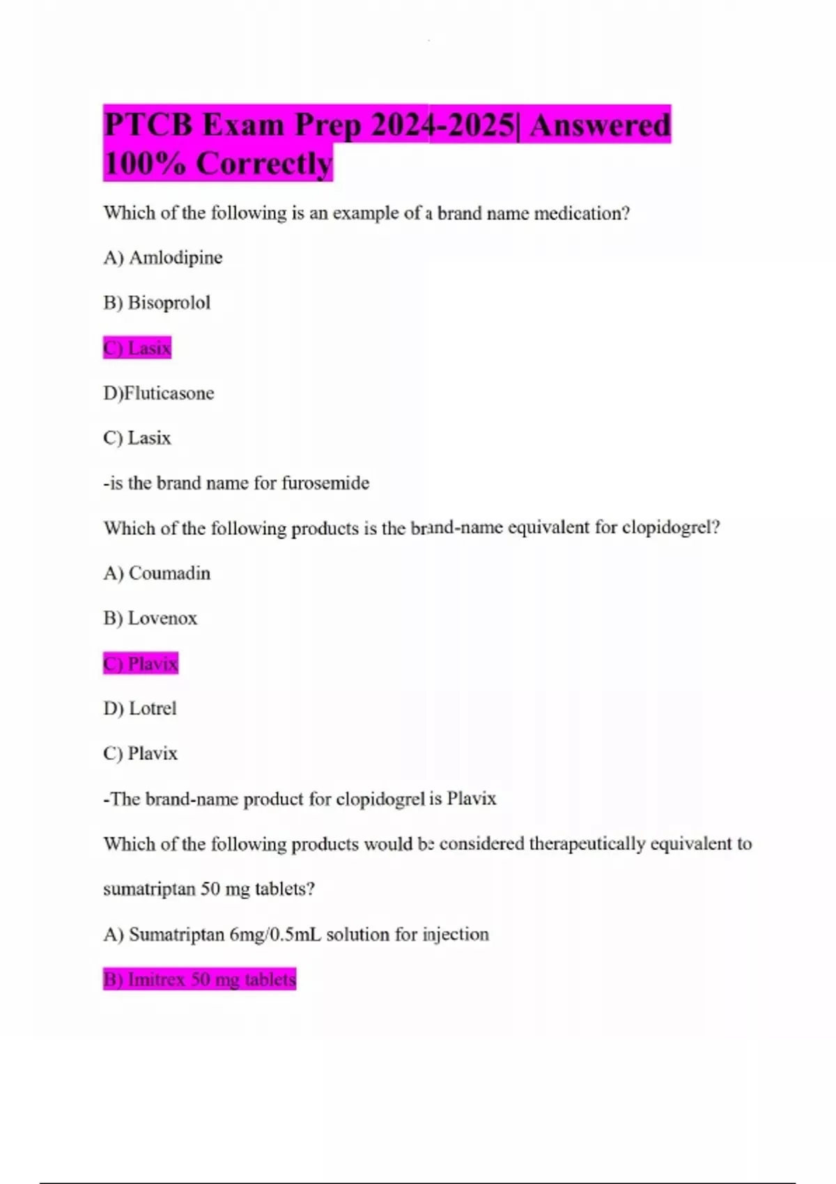 PTCB Exam Prep | Answered 100% Correctly Which of the following is an example of a brand name medication? A) Amlodipine B) Bisoprolol C) Lasix D)Fluticasone C) Lasix -is the brand name for furosemide Which of the following products is the brand-name equivalent for clopidogrel? A) Coumadin B) Lovenox C) Plavix D) Lotrel C) Plavix -The brand-name product for clopidogrel is Plavix Which of the following products would be considered therapeutically equivalent to sumatriptan 50 mg tablets? A) Sumatriptan 6mg/0.5mL solution for injection B) Imitrex 50 mg tablets C) Sumatriptan 20 mg nasal spray D) Effexor 50 mg capsules B) Imitrex 50mg tablets -Imitrex is the brand-name for sumatriptan, and the strength and dosage forms are equivalent Which of the following would be an example of a drug-disease interaction? A) A patient who takes warfarin and aspirin is at an increased risk for bleeding B) Beta-blockers can cause airway constriction, so they are contraindicated in patients who have asthma or chronic obstructive pulmonary disease C) Patients who take simvastatin should not drink grapefruit juice because it can increase the risk of side effects D) A patient taking rifampicin has orange-colored urine B) Beta-blockers can cause airway constriction, so they are contraindicated in patients who have asthma or chronic obstructive pulmonary disease -Drug-disease interactions occur when a drug interacts with or interferes with an existing medical position Tetracycline capsules should be taken on an empty stomach, at least 1 hour before or 2 hours after food. This is because certain foods, particularly dairy products, reduce its absorption. This is an example of a: A) Drug-drug interaction B) Drug-disease interaction C) Drug-food interaction D) Drug-laboratory interaction C) Drug-food interaction -occurs when the effects of a drug are changed when taken in combination with a particular food. Which of the following would be a common side effect of anticoagulants? A) Skin rash B) Excessive bruising or bleeding C) Hair loss D) Hypertension B) Excessive bruising or bleeding -Anticoagulants are also known as blood thinners because they prevent the blood from forming clots All of the following medications are indicated for epilepsy EXCEPT: A) Keppra B) Risperdal C) Dilantin D) Depakote B) Risperdal -(Risperidone) is an antipsychotic drug that is used to treat schizophrenia and other psychoses. It is not indicated for epilepsy All of the following medication classes should be avoided in elderly patients EXCEPT: A) Antihistamines B) Tricyclic antidepressants C)Benzodiazepines D) Proton pump inhibitor D) Proton pump inhibitors -Sedating drugs can lead to delirium and confusion in elderly patients as well as increase their risk of falling Thalidomide (Thalomid) is know to be harmful when taken during pregnancy. It has a high risk of causing significant birth defects in babies. The term used to describe this type of side effect is: