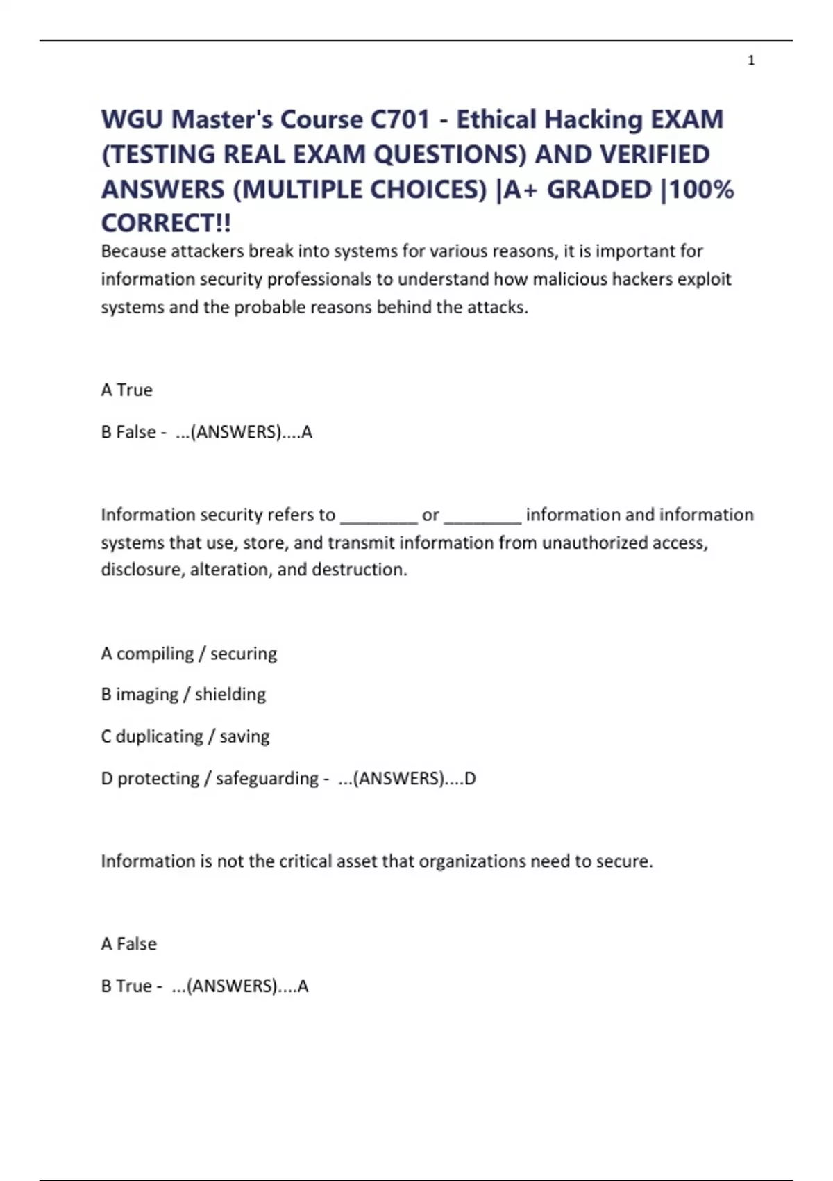 WGU Master's Course C701 - Ethical Hacking EXAM (TESTING REAL EXAM QUESTIONS) AND VERIFIED ANSWERS (MULTIPLE CHOICES) |A+ GRADED |100% CORRECT!!