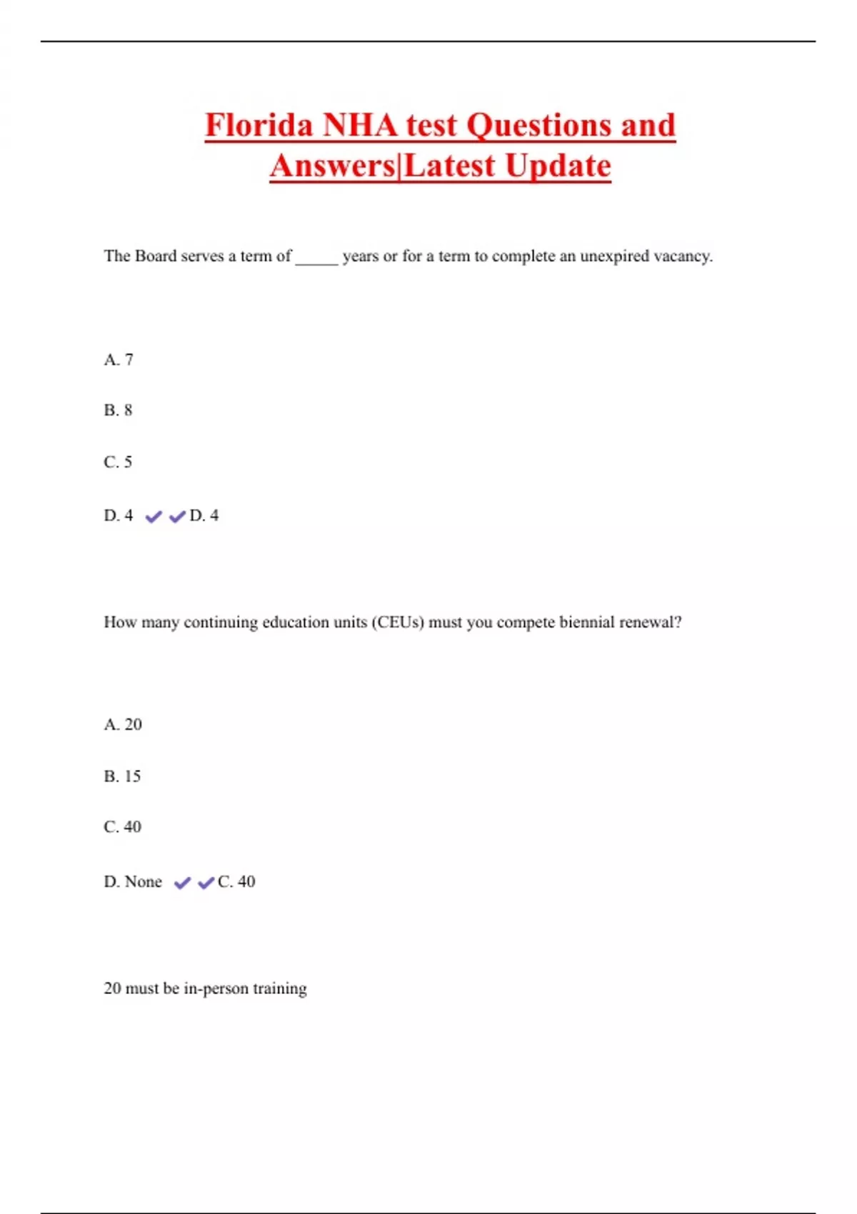 Florida NHA test Questions and Answers|Latest Update The Board serves a term of _____ years or for a term to complete an unexpired vacancy. A. 7 B. 8 C. 5 D. 4 D. 4 How many continuing education units (CEUs) must you compete biennial renewal? A. 20 B. 15 C. 40 D. None C. 40
