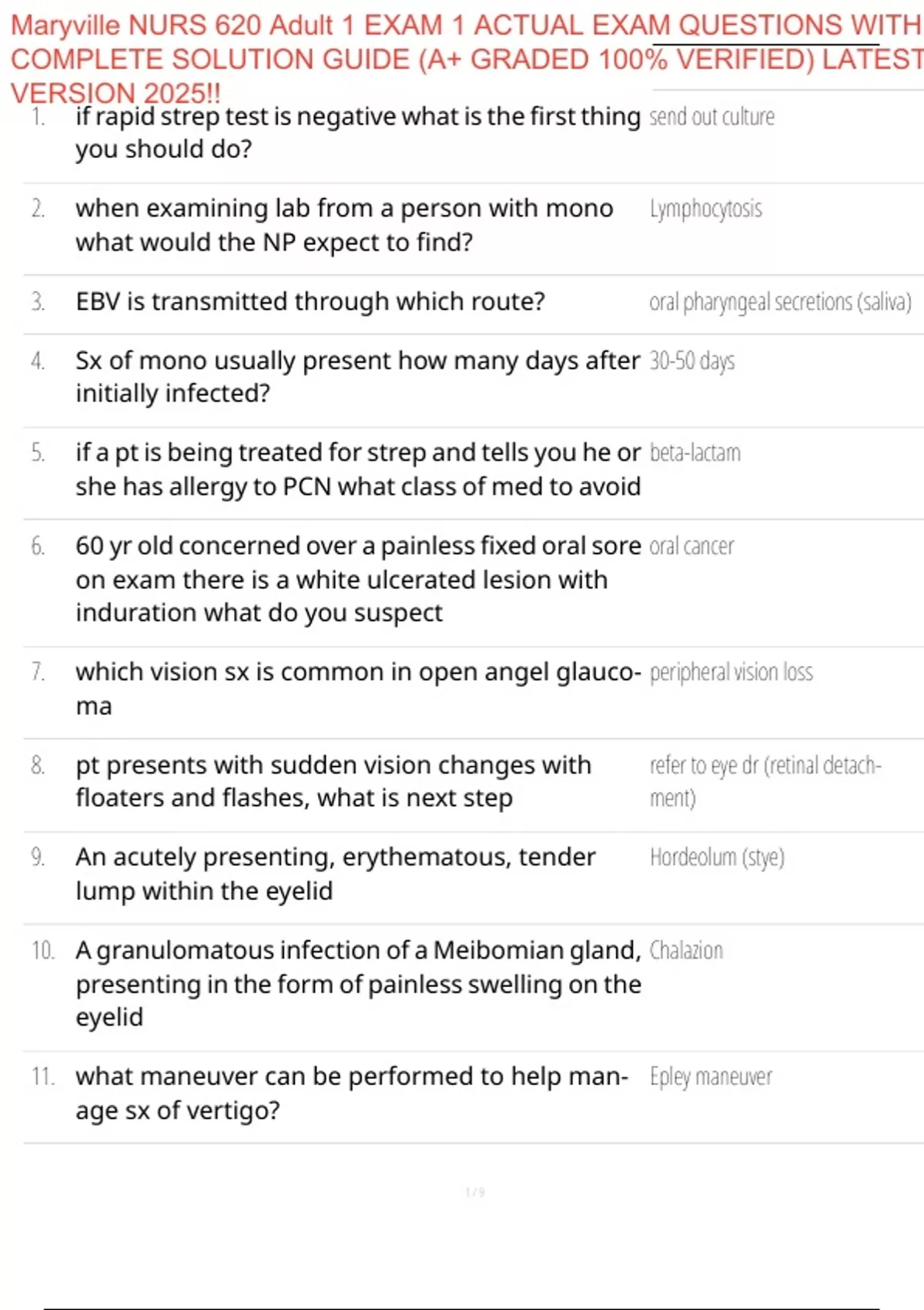Maryville NURS 620 Adult 1 EXAM 1 ACTUAL EXAM QUESTIONS WITH
