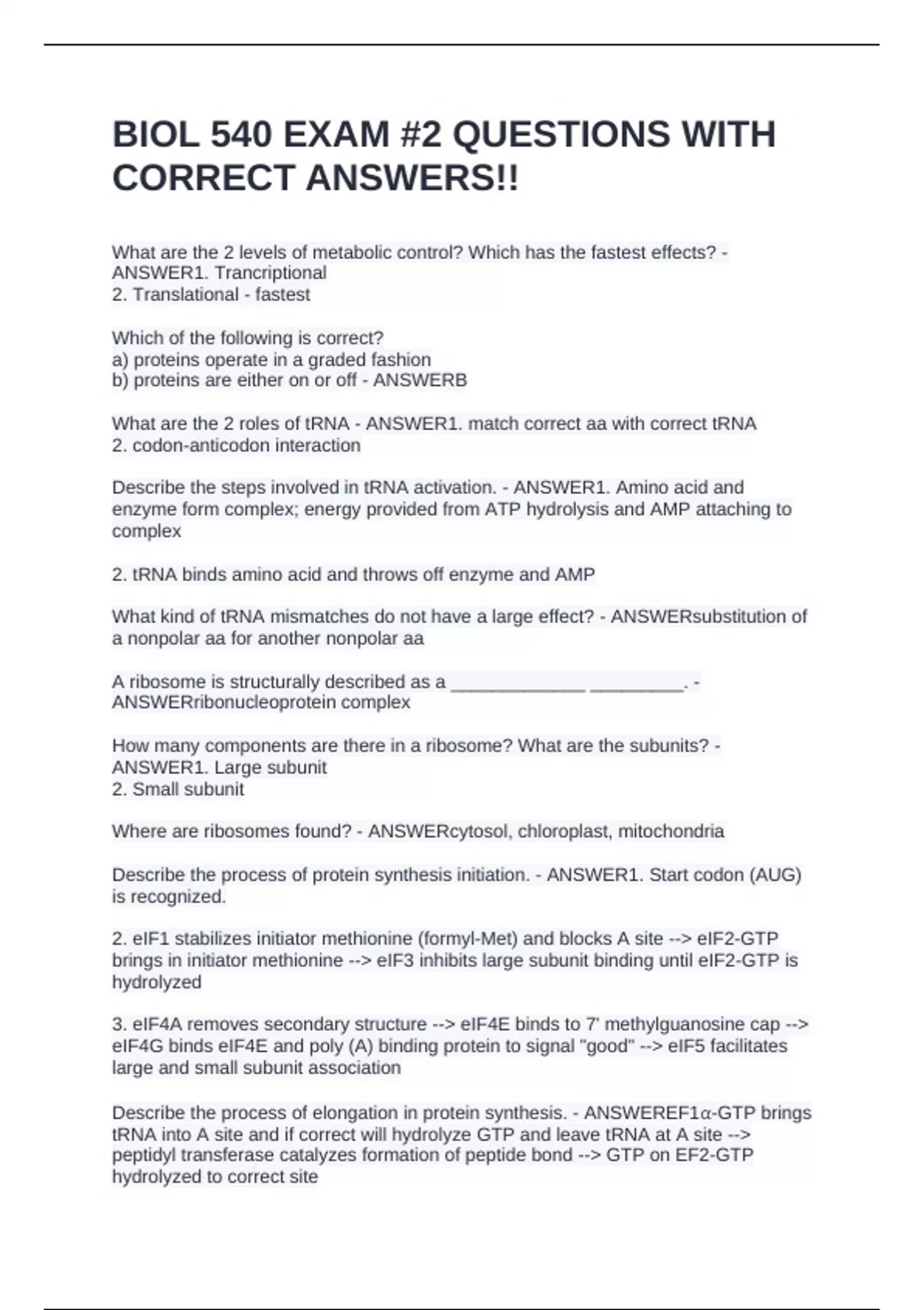 What are the 2 levels of metabolic control? Which has the fastest effects? - ANSWER1. Trancriptional 2. Translational - fastest Which of the following is correct? a) proteins operate in a graded fashion b) proteins are either on or off - ANSWERB What are the 2 roles of tRNA - ANSWER1. match correct aa with correct tRNA 2. codon-anticodon interaction Describe the steps involved in tRNA activation. - ANSWER1. Amino acid and enzyme form complex; energy provided from ATP hydrolysis and AMP attaching to complex 2. tRNA binds amino acid and throws off enzyme and AMP What kind of tRNA mismatches do not have a large effect? - ANSWERsubstitution of a nonpolar aa for another nonpolar aa A ribosome is structurally described as a _____________ _________. - ANSWERribonucleoprotein complex How many components are there in a ribosome? What are the subunits? - ANSWER1. Large subunit 2. Small subunit Where are ribosomes found? - ANSWERcytosol, chloroplast, mitochondria Describe the process of protein synthesis initiation. - ANSWER1. Start codon (AUG) is recognized.