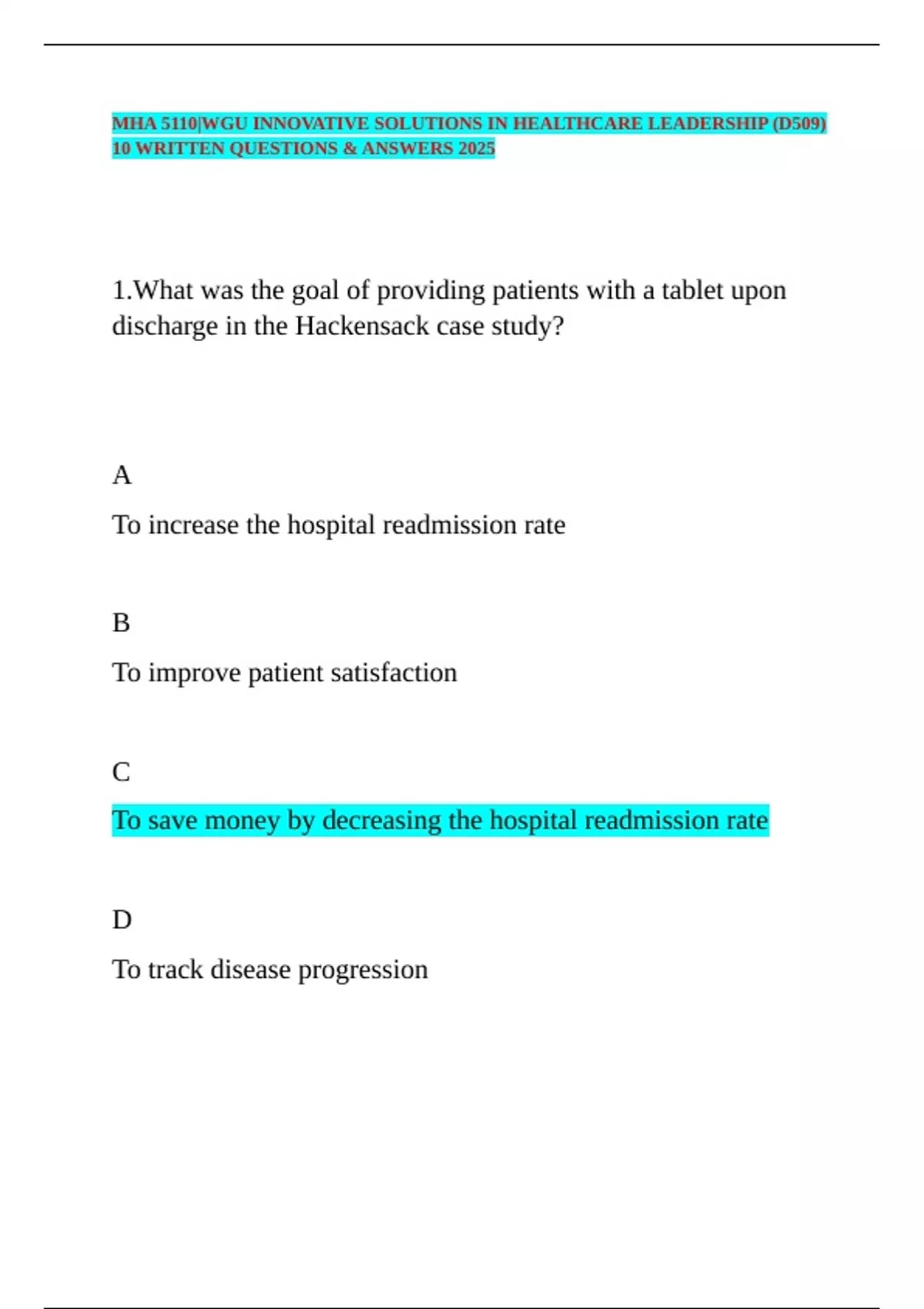 MHA 5110|WGU INNOVATIVE SOLUTIONS IN HEALTHCARE LEADERSHIP (D509) 10 WRITTEN QUESTIONS & ANSWERS 2025