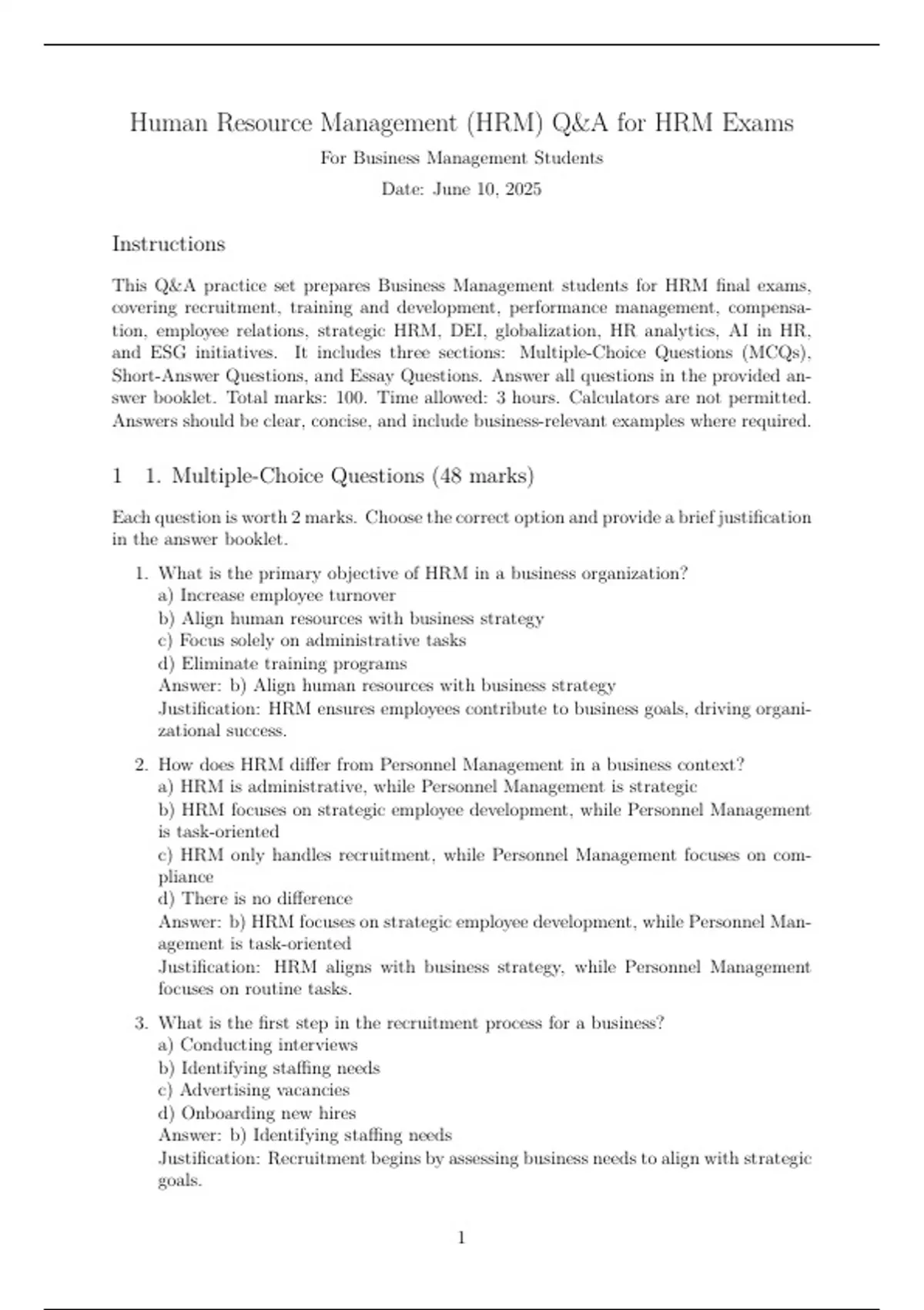 This Q&A practice set prepares Business Management students for HRM final exams,