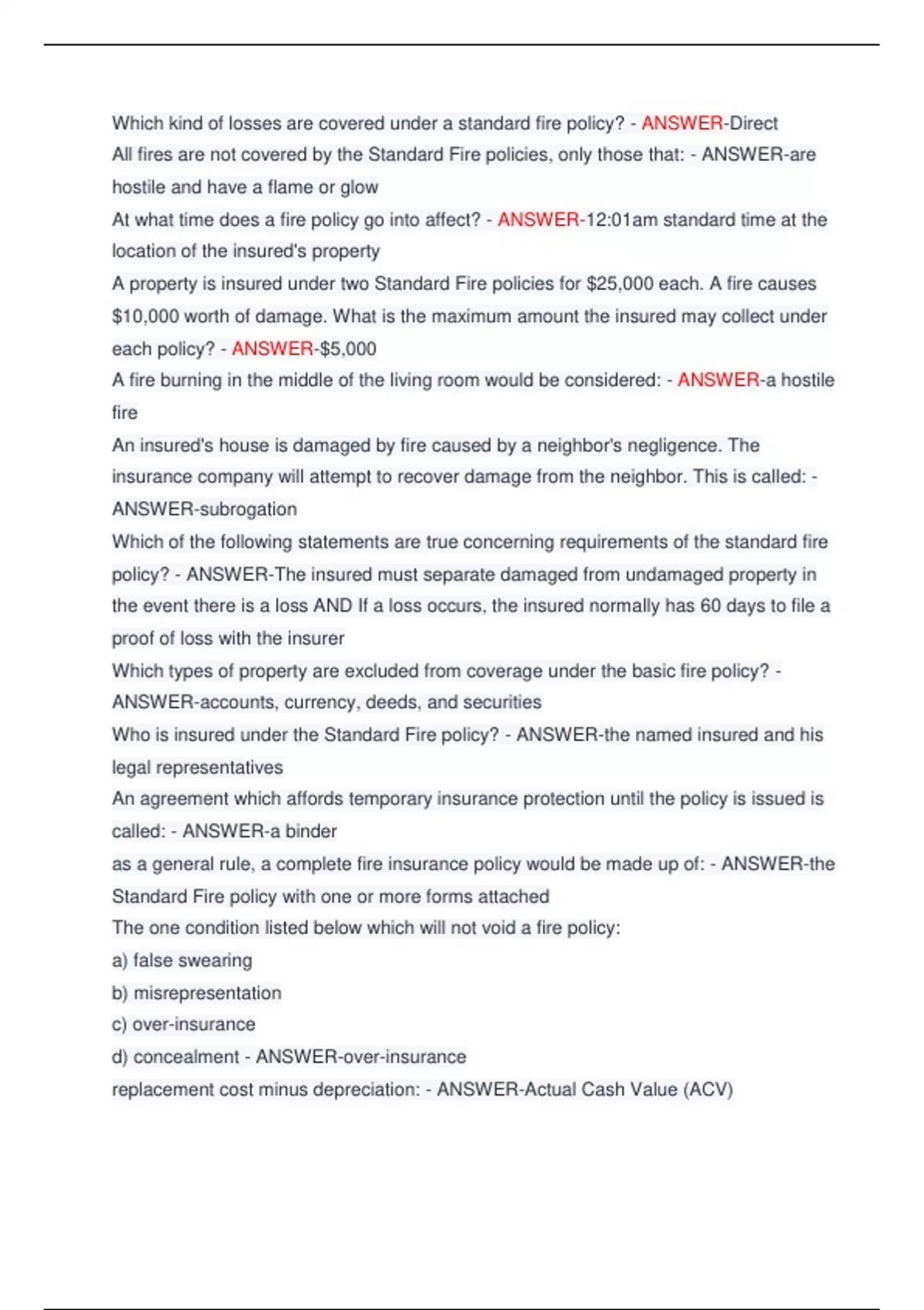 At what time does a fire policy go into affect? - ANSWER-12:01am standard time at the