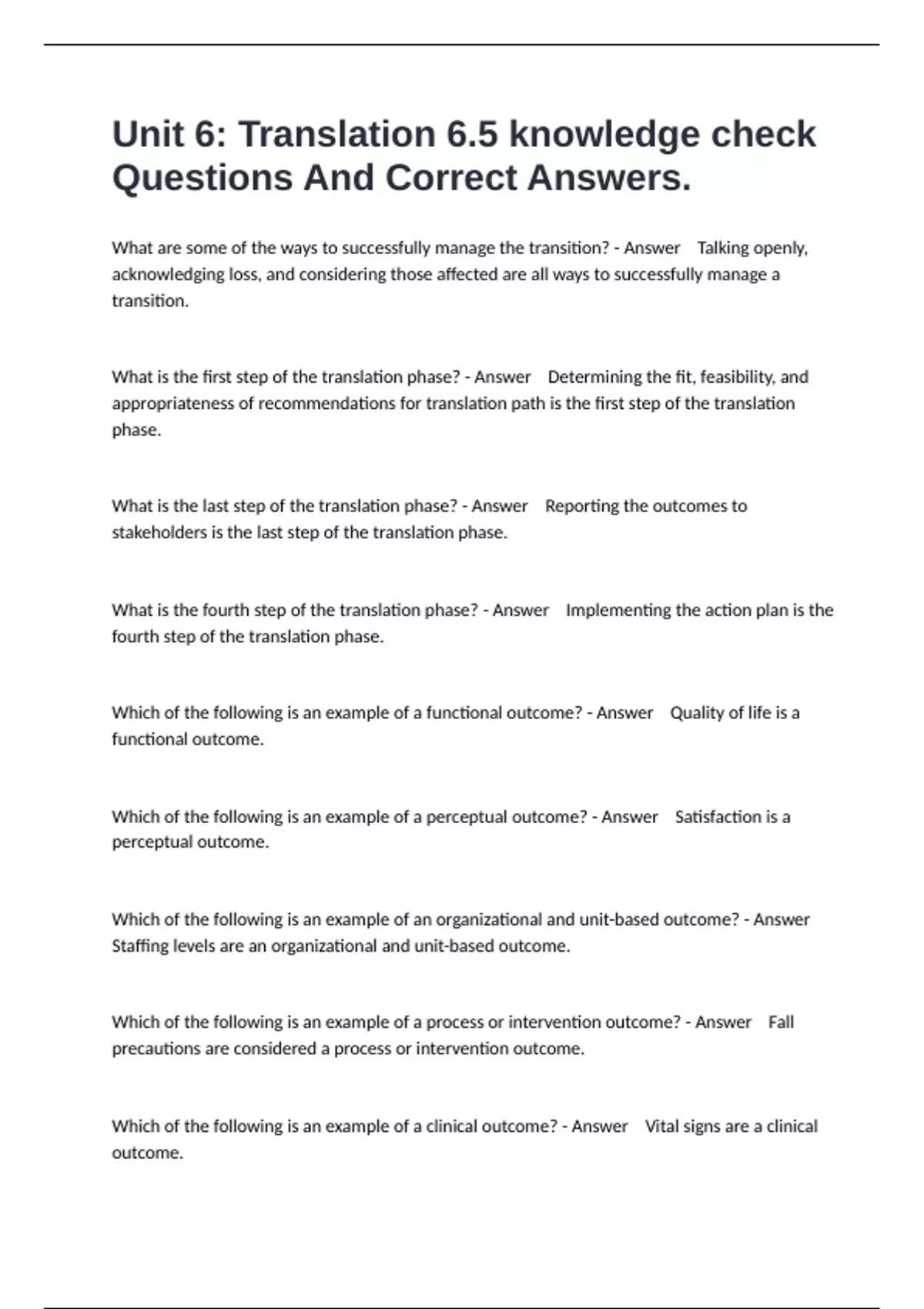 Which of the following is an example of a functional outcome? - Answer Quality of life is a