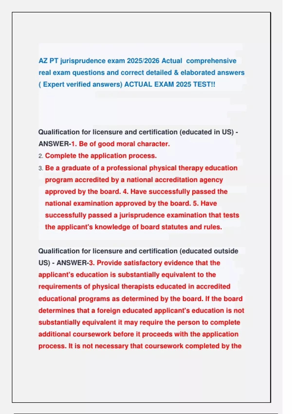 AZ PT jurisprudence exam 2025/2026 Actual comprehensive real exam questions and correct detailed & elaborated answers ( Expert verified answers) ACTUAL EXAM 2025 TEST!!