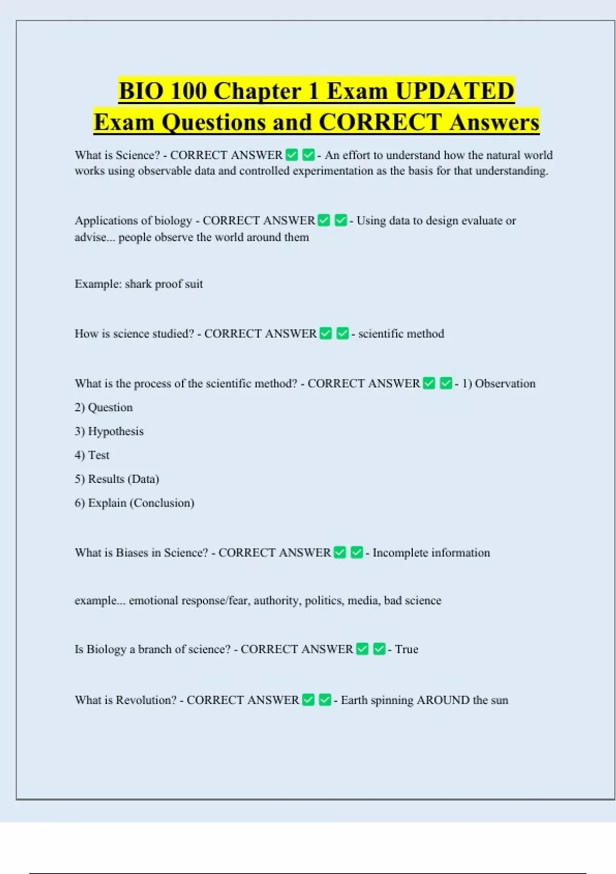 BIO 100 Chapter 1 Exam UPDATED Exam Questions and CORRECT Answers What is Science? - CORRECT ANSWER - An effort to understand how the natural world works using observable data and controlled experimentation as the basis for that understanding. Applications of biology - CORRECT ANSWER advise... people observe the world around them Example: shark proof suit How is science studied? - CORRECT ANSWER - Using data to design evaluate or - scientific method