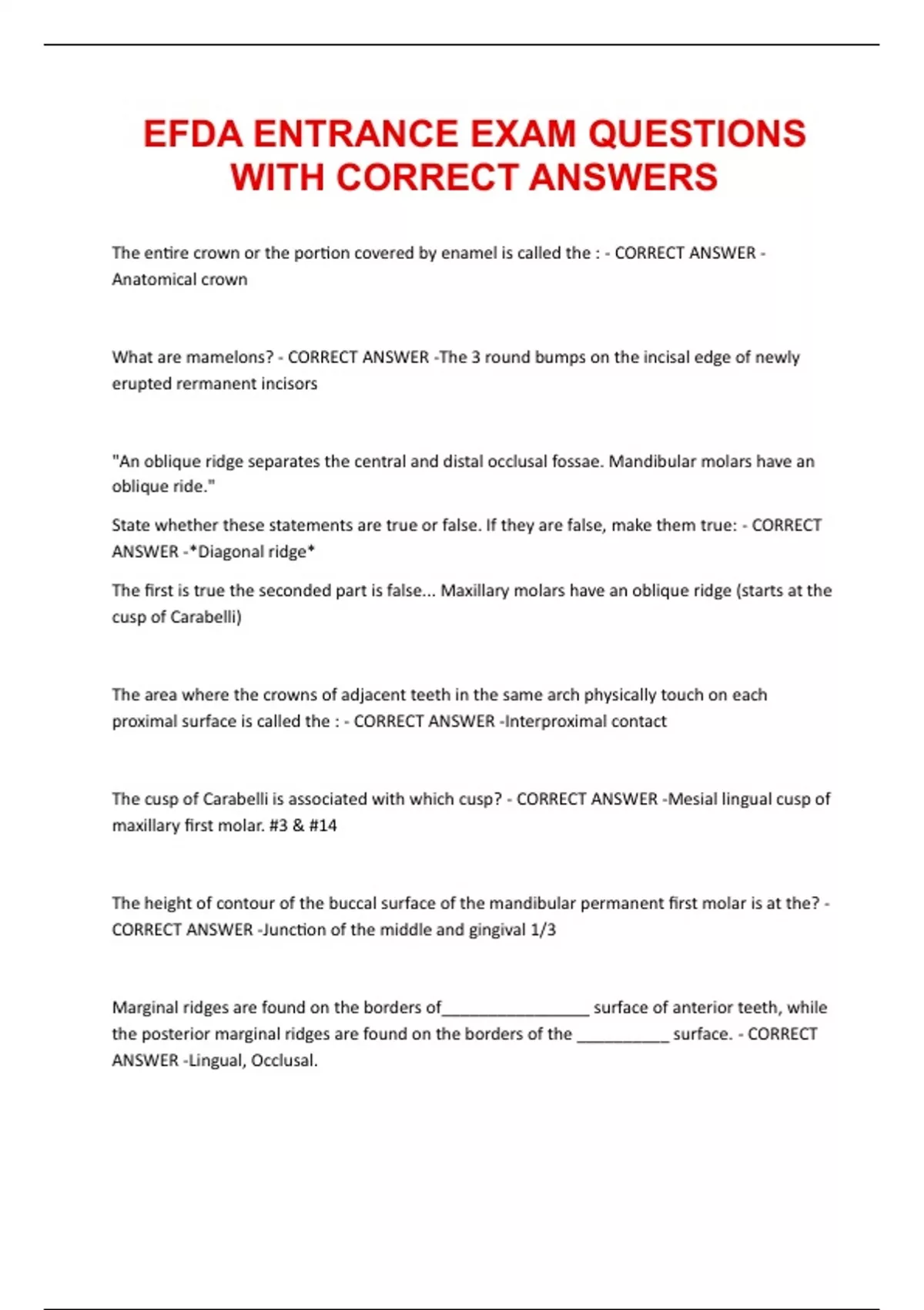 EFDA ENTRANCE EXAM QUESTIONS WITH CORRECT ANSWERS 2025