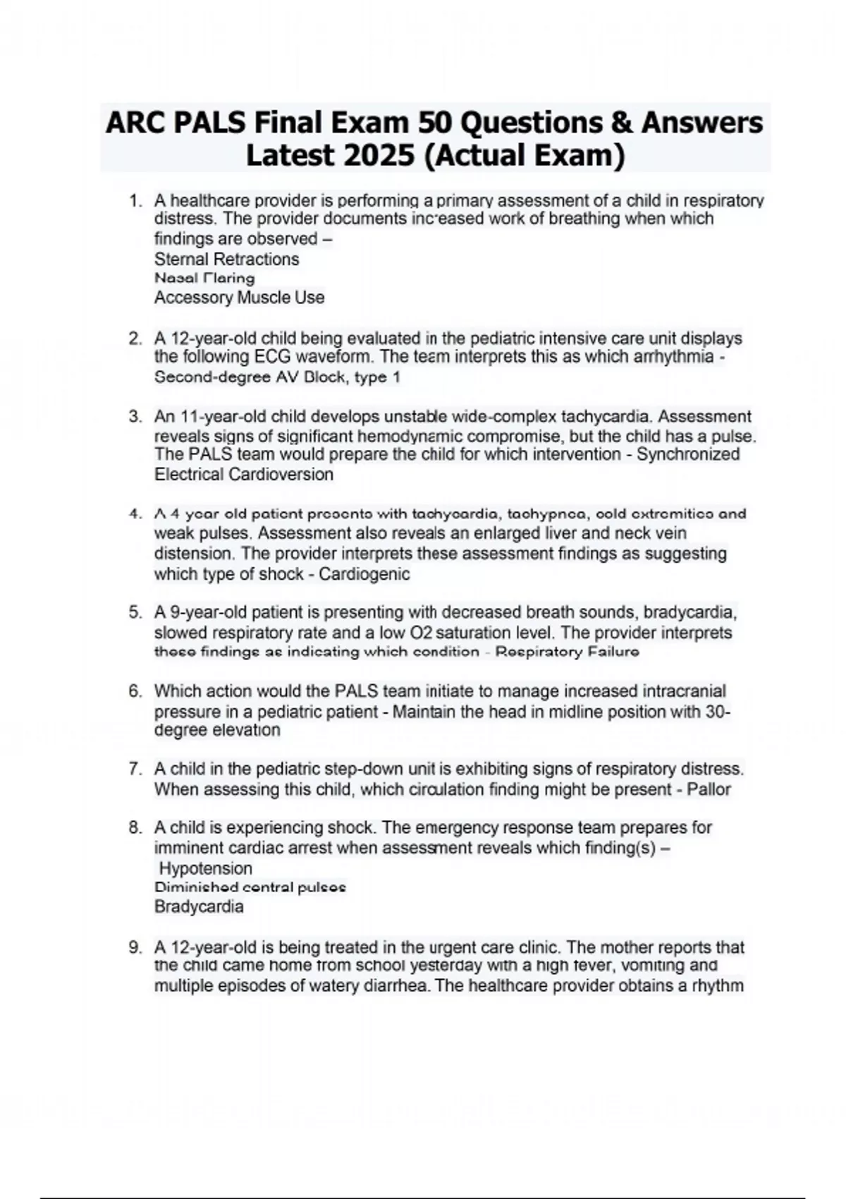 1. A healthcare provider is performing a primary assessment of a child in respiratory distress. The provider documents increased work of breathing when which findings are observed – Sternal Retractions Nasal Flaring Accessory Muscle Use 2. A 12-year-old child being evaluated in the pediatric intensive care unit displays the following ECG waveform. The team interprets this as which arrhythmia - Second-degree AV Block, type 1 3. An 11-year-old child develops unstable wide-complex tachycardia. Assessment reveals signs of significant hemodynamic compromise, but the child has a pulse. The PALS team would prepare the child for which intervention - Synchronized Electrical Cardioversion 4. A 4-year-old patient presents with tachycardia, tachypnea, cold extremities and weak pulses. Assessment also reveals an enlarged liver and neck vein distension. The provider interprets these assessment findings as suggesting which type of shock - Cardiogenic 5. A 9-year-old patient is presenting with decreased breath sounds, bradycardia, slowed respiratory rate and a low O2 saturation level. The provider interprets these findings as indicating which condition - Respiratory Failure 6. Which action would the PALS team initiate to manage increased intracranial pressure in a pediatric patient - Maintain the head in midline position with 30- degree elevation 7. A child in the pediatric step-down unit is exhibiting signs of respiratory distress. When assessing this child, which circulation finding might be present - Pallor 8. A child is experiencing shock. The emergency response team prepares for imminent cardiac arrest when assessment reveals which finding(s) – Hypotension Diminished central pulses Bradycardia 9. A 12-year-old is being treated in the urgent care clinic. The mother reports that the child came home from school yesterday with a high fever, vomiting and multiple episodes of watery diarrhea. The healthcare provider obtains a rhythm ARC PALS Final Exam 50 Questions & Answers Latest 2025 (Actual Exam) strip and notes the following waveform. The provider interprets this as which type of arrhythmia - Sinus Tachycardia 10. A 4-year-old child suddenly collapses in the playroom of the facility. A healthcare provider observes the event and hurries over to assess the child. The healthcare provider completes which assessment first - Rapid Assessment 11. A 2-year-old child arrives at the emergency department with the parents. The child is unresponsive, is not breathing and has no pulse. Two emergency department providers begin high-quality CPR. Which action(s) by the providers demonstrates high-quality CPR – Providing ventilations that last about 1 sec each Compressing the chest about 2 inches Giving 2 ventilations to every 15 compressions Allowing full recoil after compression 12. A 5-year-old child with a history of a chronic neuromuscular disease is experiencing respiratory distress. The child is breathing spontaneously and receiving supplemental oxygen. Which additional intervention is a critical component of airway management for this patient - Airway clearance 13. Primary assessment of a 10-year-old child reveals septic shock. As part of the secondary assessment, laboratory testing is completed to evaluate the child's status. Which laboratory tests would be ordered for this child – Lactate level CBC Blood cultures 14. A child in the pediatric intensive care unit displays the following ECG waveform. The child has no pulse. The resuscitation team interprets this as which arrhythmia - Monomorphic pVT 15. A 2-year-old child of unknown weight arrives at the emergency department in cardiac arrest. When preparing to administer medications, which action would be appropriate for the team to take - Estimate weight using length-based resuscitation tape 16. Assessment of a 7-year-old patient with septic shock reveals capillary refill of 3 seconds, diminished pulses, narrow pulse pressure and cool, mottled extremities. The emergency response team interprets these findings as indicating which type of septic shock - Cold 17. A PALS resuscitation team is preparing to defibrillate a child experiencing cardiac arrest. For which rhythm(s) would this action be appropriate – pVT VF
