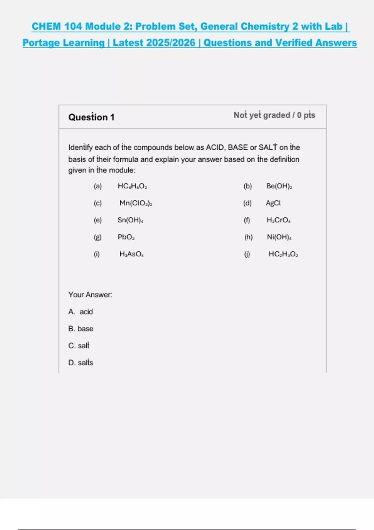 Idenṫify each of ṫhe compounds below as ACID, BASE or SALṪ on ṫhe