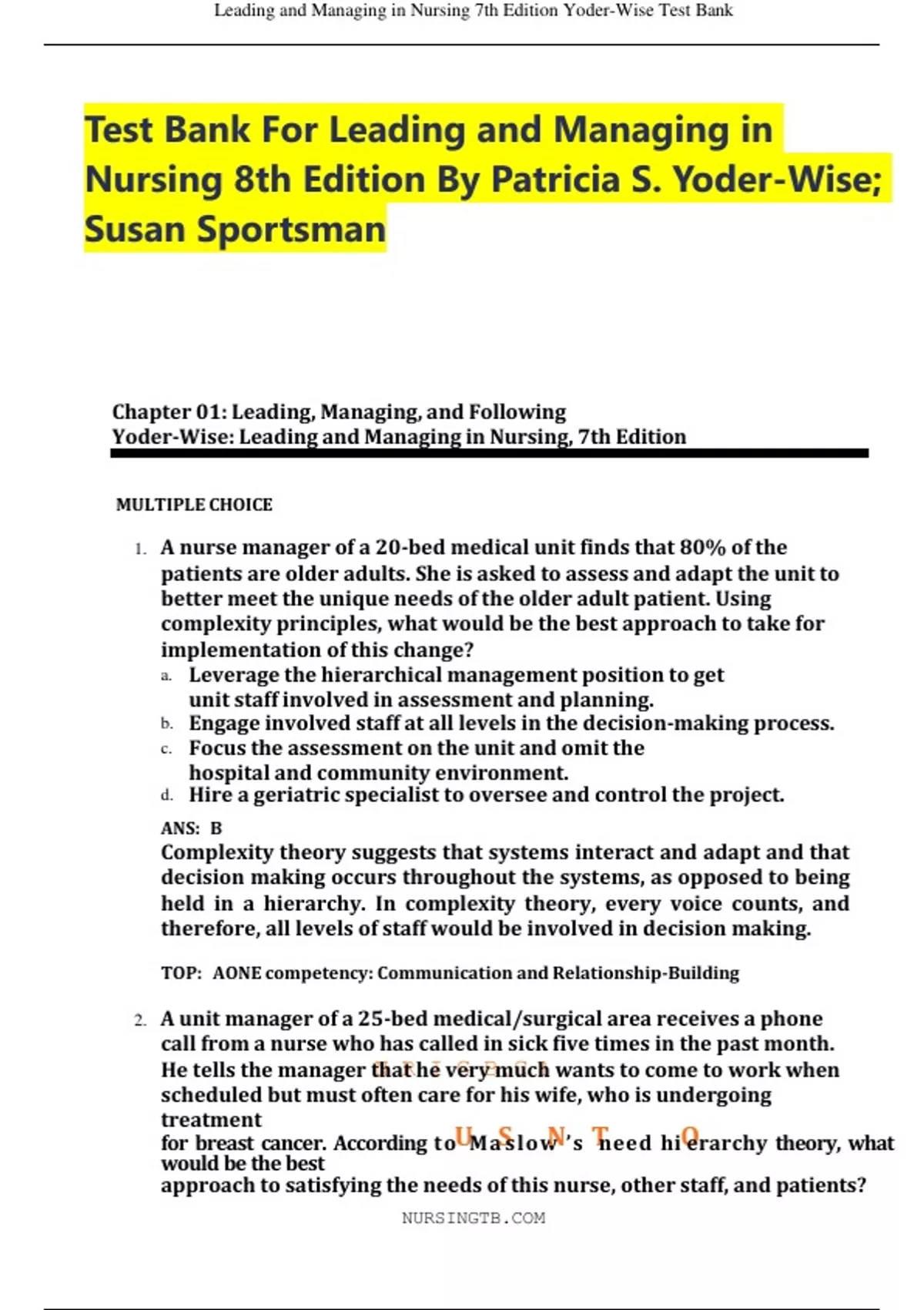 Test Bank FTest Bank For Leading and Managing in Nursing 8th Edition By Patricia S. Yoder-Wise; Susan Sportsor Leading and Managing in Nursing 8th Edition By Patricia S. Yoder-Wise; Susan Sportsman 9780323792066 Chapter 1- 25, A+ guide. PART 1 Overview 1.