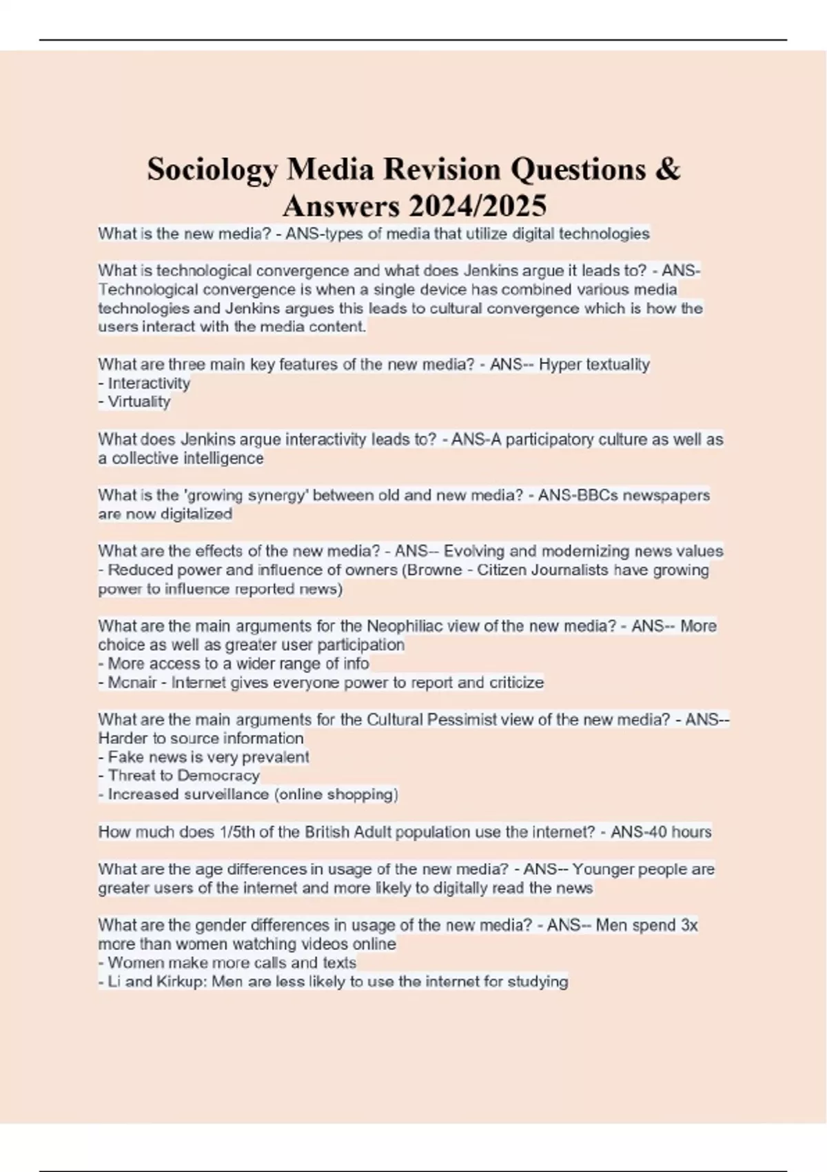 Sociology Media Revision Questions & Answers 2024/2025 What is the new media? - ANS-types of media that utilize digital technologies What is technological convergence and what does Jenkins argue it leads to? - ANS-Technological convergence is when a single device has combined various media technologies and Jenkins argues this leads to cultural convergence which is how the users interact with the media content. What are three main key features of the new media? - ANS-- Hyper textuality - Interactivity - Virtuality What does Jenkins argue interactivity leads to? - ANS-A participatory culture as well as a collective intelligence What is the 'growing synergy' between old and new media? - ANS-BBCs newspapers are now digitalized What are the effects of the new media? - ANS-- Evolving and modernizing news values - Reduced power and influence of owners (Browne - Citizen Journalists have growing power to influence reported news) What are the main arguments for the Neophiliac view of the new media? - ANS-- More choice as well as greater user participation - More access to a wider range of info - Mcnair - Internet gives everyone power to report and criticize What are the main arguments for the Cultural Pessimist view of the new media? - ANS-- Harder to source information - Fake news is very prevalent - Threat to Democracy - Increased surveillance (online shopping) How much does 1/5th of the British Adult population use the internet? - ANS-40 hours What are the age differences in usage of the new media? - ANS-- Younger people are greater users of the internet and more likely to digitally read the news What are the gender differences in usage of the new media? - ANS-- Men spend 3x more than women watching videos online - Women make more calls and texts - Li and Kirkup: Men are less likely to use the internet for studying What does Jones argue the new media amplifies? - ANS-Existing societal inequalities such as poverty and unemployment - there is a digital underclass. What are some formal controls of the media? - ANS-- Law of libel - 2010 Equality Act forbidding any opinions encouraging hatred against ethnic or religious groups What is Ofcom? - ANS-Media regulator who aim to further consumer interests etc. What are Bagdikian’s features of media ownership? - ANS-- Global conglomeration - Vertical and horizontal integration - Concentrated ownership - technological convergence What do Marxists argue about the media and ideology? - ANS-The media acts as an ISA and induces a false consciousness onto the proletariat What is the main argument for instrumental marxists? - ANS-- Owner’s control media content and manipulate the audiences by spreading capitalist ideologies - Owners ultimately dictate the content - The audience is passive and sees no issues What are two critiques of instrumental marxists? - ANS-- Pluralists argue with the growth of citizen journalism; more and more power is given to the powerless. - The state regulates the media so no one person has too much influence What are the main arguments for hegemonic marxists? - ANS-- Media spreads the ruling class ideology therefore legitimizing the elite power - However, owners don’t have direct influence (50% journalists are privately educated) and many have a very Eurocentric white middle class view. - Media contains very minimal critical content in order to attract more audiences and gain higher revenue. What is a criticism of the hegemonic Marxist view? - ANS-- They undermine the power and influence of the owners - for example Rupert Murdoch got all 175 newspapers he owned to adopt his political right-wing views. What are the main arguments for Pluralism? - ANS-- Media content is driven by the consumers and journalists have high editorial independence as long as they attract and gain audiences to make profit - Audience are active and can choose what they do and don’t want to watch and the new media allows everyone to share ideas. Give two criticisms of the pluralistic view? - ANS-- Media owners hire editors and managers who share similar views to them - Journalists views normally come from those higher up in power. What do postmodernists argue about the media? - ANS—recognize diversity and argue that media has 3 characteristics: - media defines society -postmodern societies are underpinned by globalization - truth is irrelevant what does Baudrillard argue? - ANS-People now find it hard to distinguish between reality and the media version of reality. What are two critiques of postmodernism? - ANS-- Little actual research to back up arguments - Still great structural inequalities What is the difference between popular and high culture? - ANS-- Popular culture is produced for a mass audience and designed to be enjoyed by the masses whereas high culture is seen as elite and respectable such as classical music and Dickens etc. What do postmodernists argue about the differences between high and popular culture? - ANS-- The differences are weakening - e.g. Original/Classical music can be mass consumed at home online on platforms such as YouTube. What do marxists argue about popular culture? - ANS-- Form of social control and a lot of media content is dumbed down in order to create a passive, unthinking audience. - It is a form of social repression. What does Strinati argue against this view? - ANS-- There is no single mass culture and people have consumer choice over what they consume What do we mean by a global popular culture? - ANS-- Increasingly similar products and ways of life globally. - Sklair (2012) argues products are sold to promote the happy western lifestyle. What do cultural imperialists ultimately argue? - ANS-- The USA is imposing its media products and popular culture on less powerful nations. - Fenton argues global culture rarely ever means universal. - This ultimately undermines local cultures globally. What does McChesney argue is the main reason cultural imperialism exists? - ANS-- Increased concentration of the world’s m